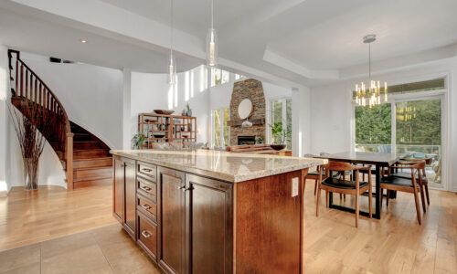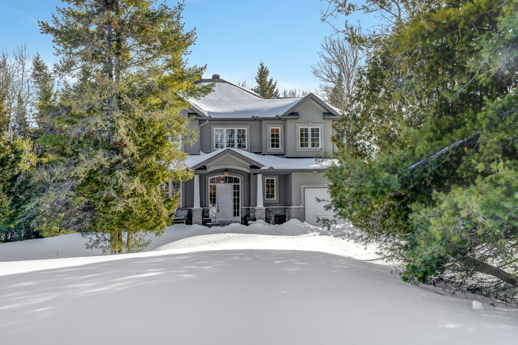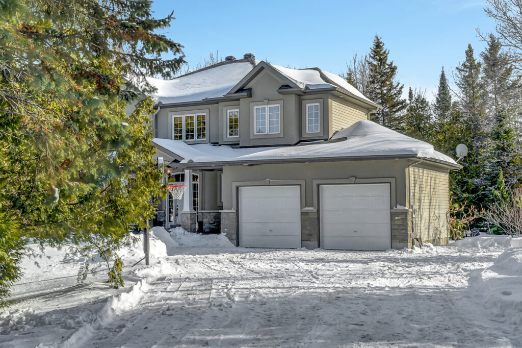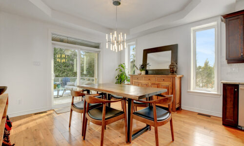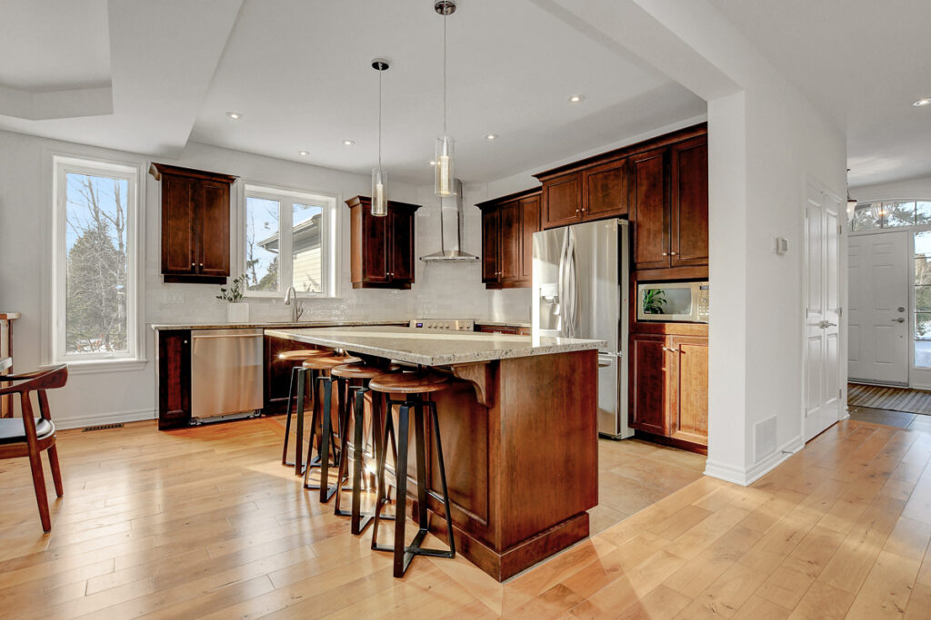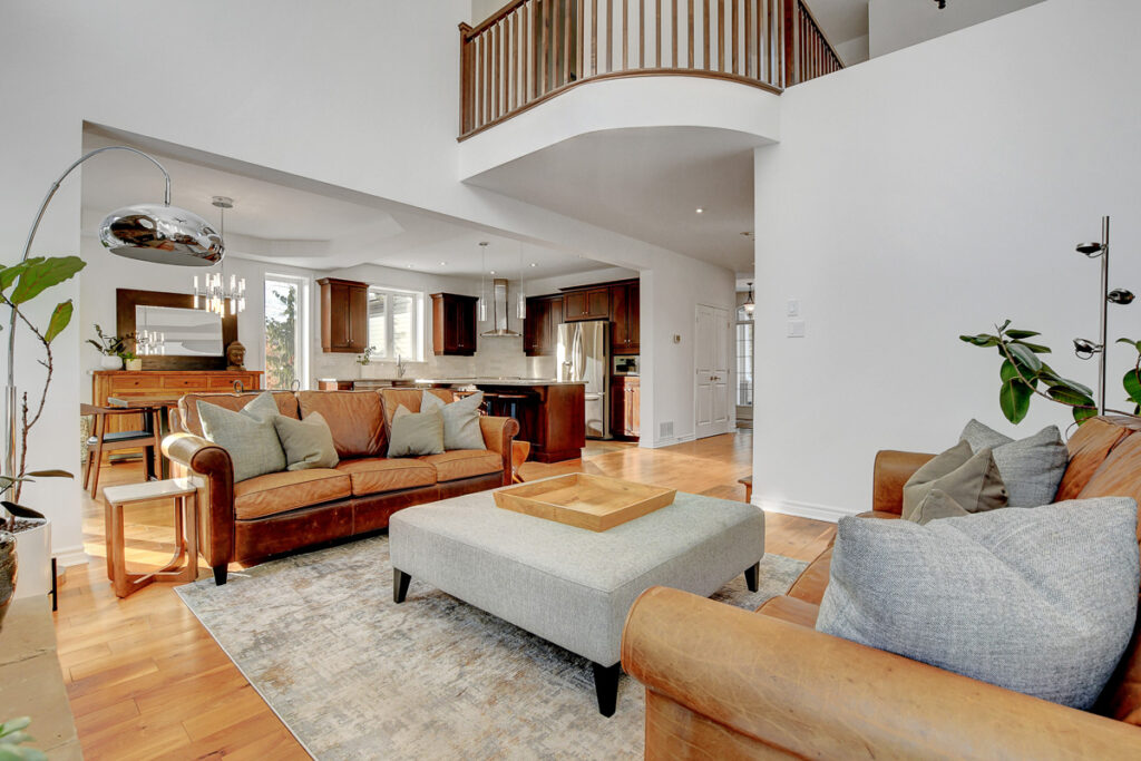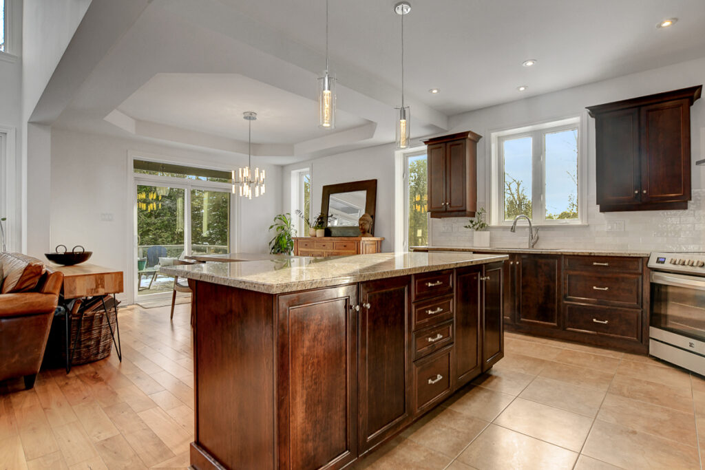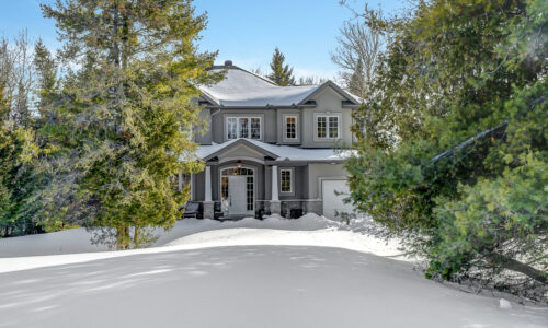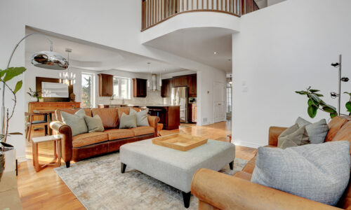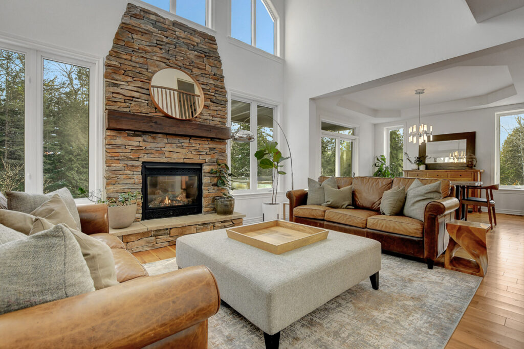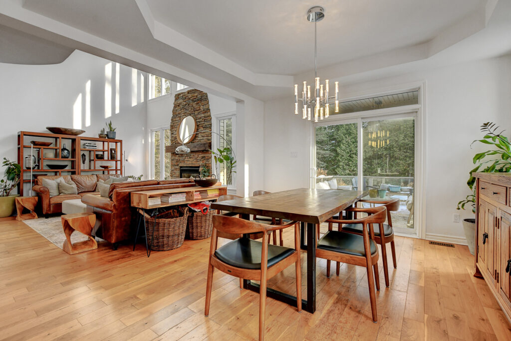 Mid-tone engineered hardwood floors, crisp white walls, tall ceilings & expansive windows that flood the home with natural light. Spacious foyer connects to a well-designed laundry & mudroom with storage + garage access. Separate family room offers flexibility for a lounging area or private home office. Stunning open-concept layout with a showstopping living room boasting soaring two-storey ceilings, dramatic windows overlooking the scenic treed backyard + gas fireplace with stone surround. Dining area sits beneath a tray ceiling and provides direct access to a large, raised covered cedar deck-perfect. Kitchen features rich dark wood cabinetry, granite counters, subway tile backsplash and a generous centre island. Primary retreat complete with a spacious walk-in closet and a fully appointed ensuite bath. Three additional bedrooms share a well-designed full bathroom with double sinks.
