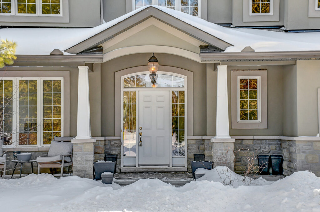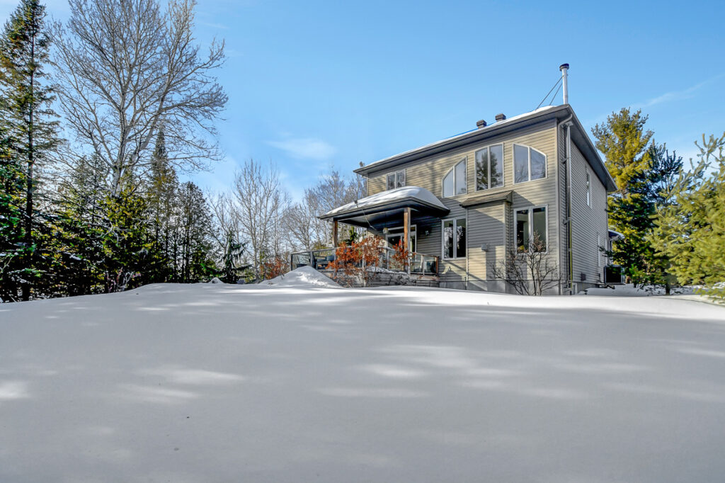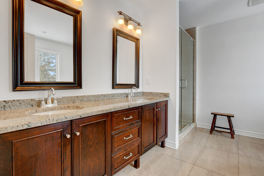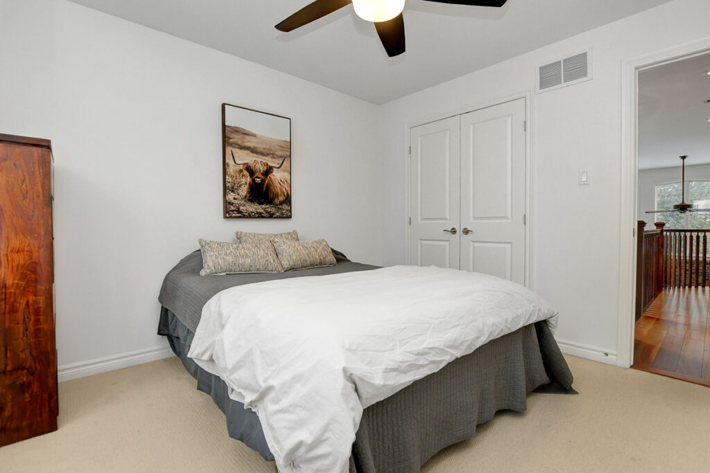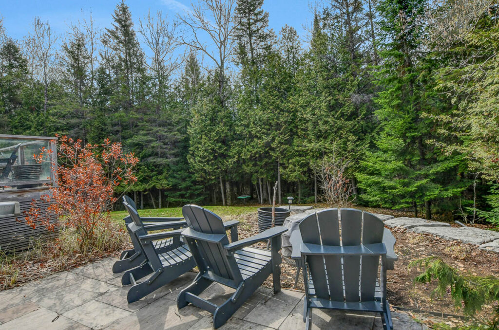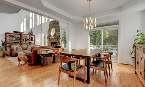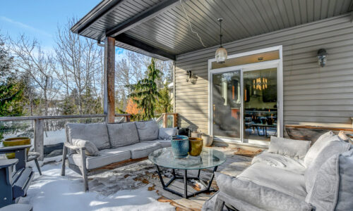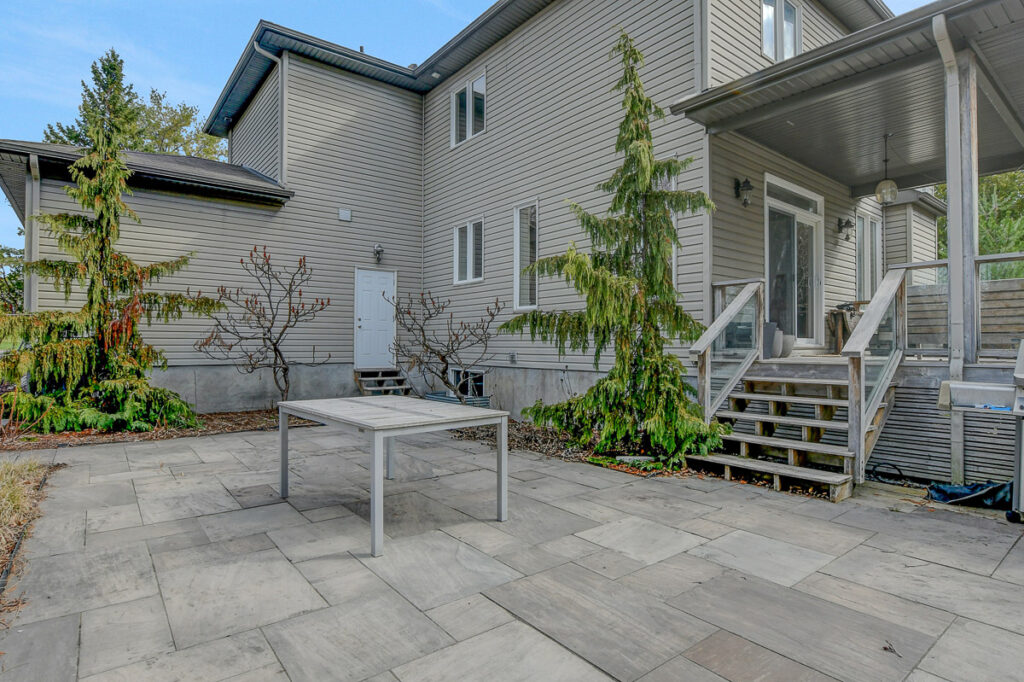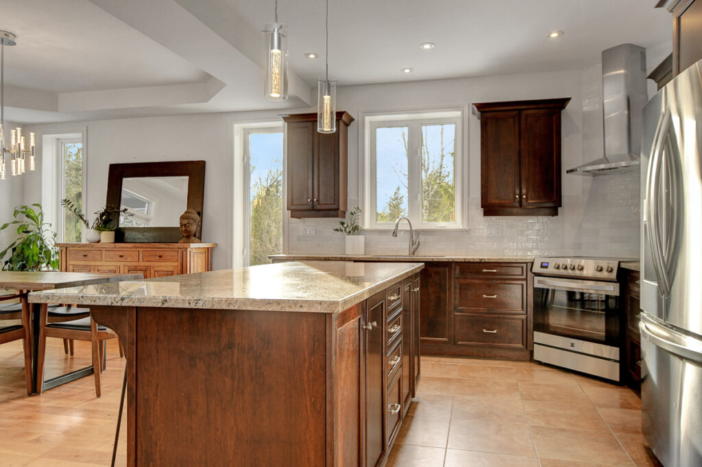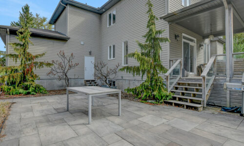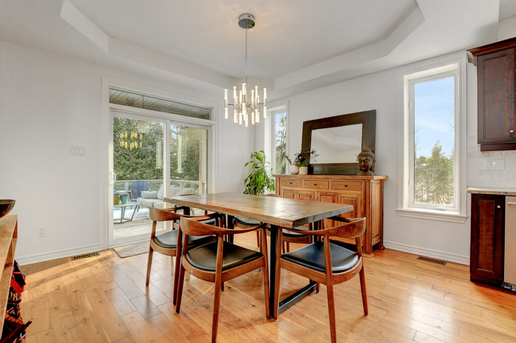 Mid-tone engineered hardwood floors, crisp white walls, tall ceilings & expansive windows that flood the home with natural light. Spacious foyer connects to a well-designed laundry & mudroom with storage + garage access. Separate family room offers flexibility for a lounging area or private home office. Stunning open-concept layout with a showstopping living room boasting soaring two-storey ceilings, dramatic windows overlooking the scenic treed backyard + gas fireplace with stone surround. Dining area sits beneath a tray ceiling and provides direct access to a large, raised covered cedar deck-perfect. Kitchen features rich dark wood cabinetry, granite counters, subway tile backsplash and a generous centre island. Primary retreat complete with a spacious walk-in closet and a fully appointed ensuite bath. Three additional bedrooms share a well-designed full bathroom with double sinks.