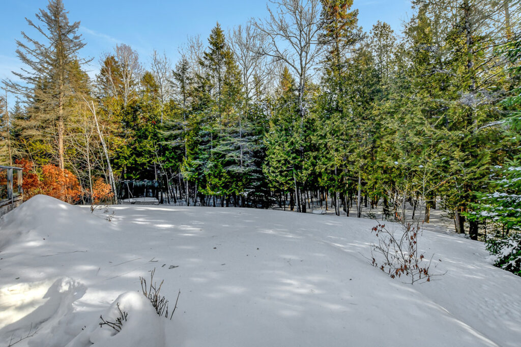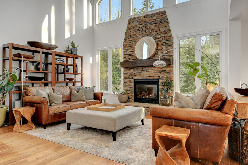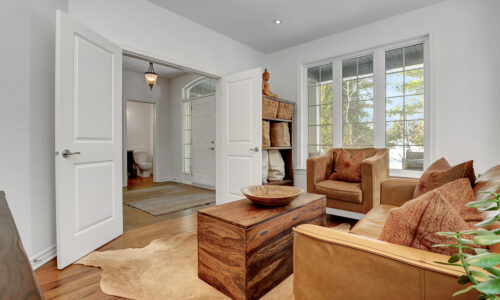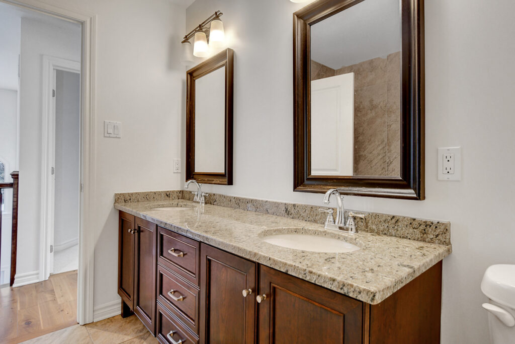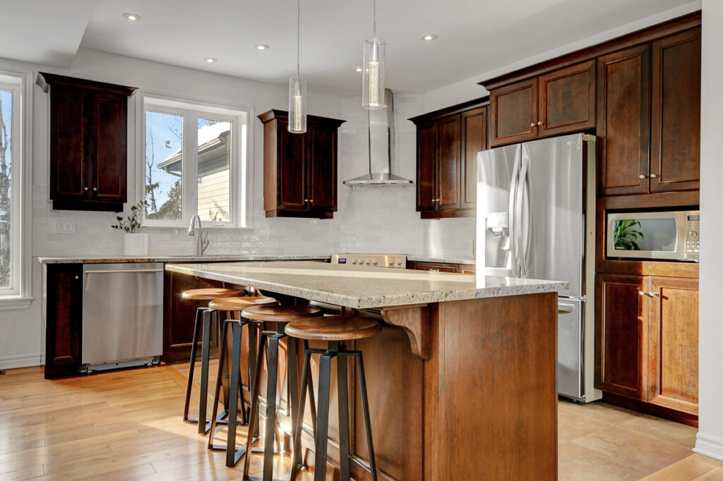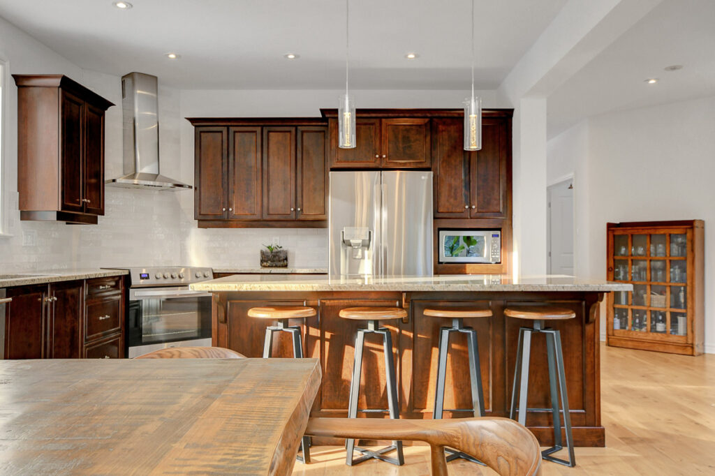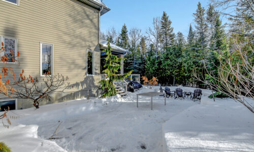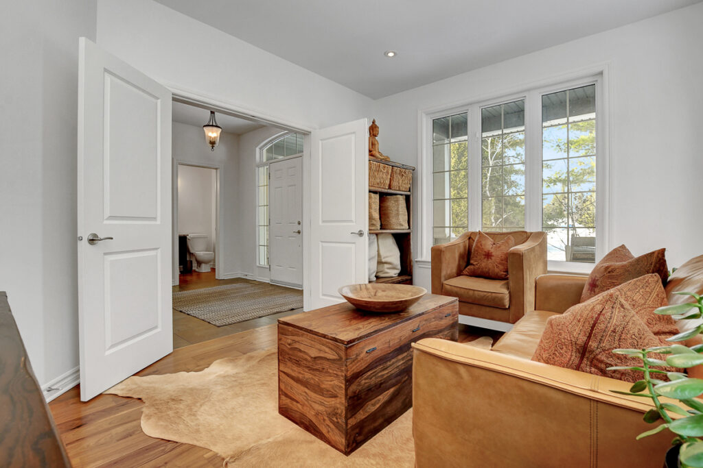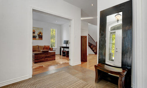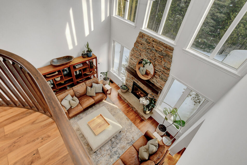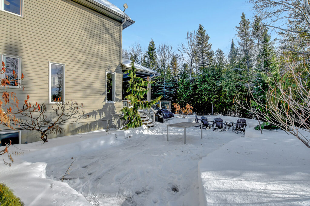 Mid-tone engineered hardwood floors, crisp white walls, tall ceilings & expansive windows that flood the home with natural light. Spacious foyer connects to a well-designed laundry & mudroom with storage + garage access. Separate family room offers flexibility for a lounging area or private home office. Stunning open-concept layout with a showstopping living room boasting soaring two-storey ceilings, dramatic windows overlooking the scenic treed backyard + gas fireplace with stone surround. Dining area sits beneath a tray ceiling and provides direct access to a large, raised covered cedar deck-perfect. Kitchen features rich dark wood cabinetry, granite counters, subway tile backsplash and a generous centre island. Primary retreat complete with a spacious walk-in closet and a fully appointed ensuite bath. Three additional bedrooms share a well-designed full bathroom with double sinks.