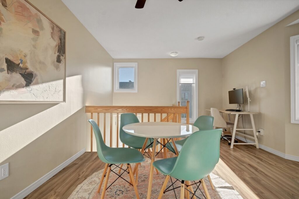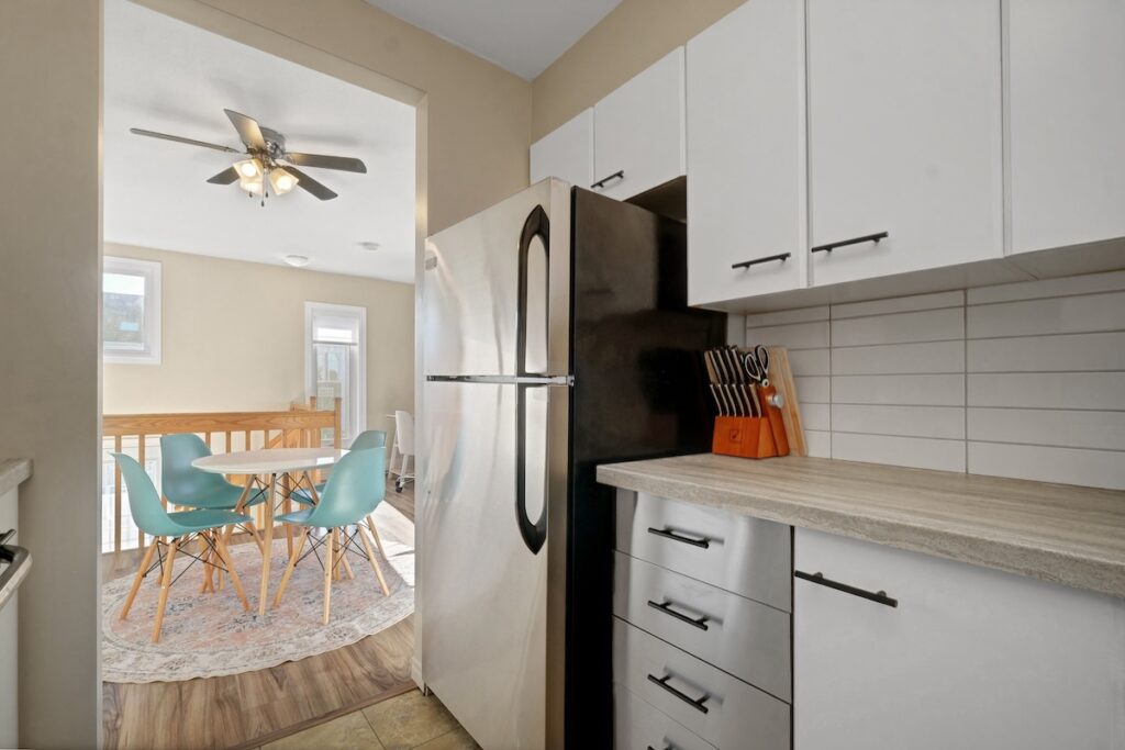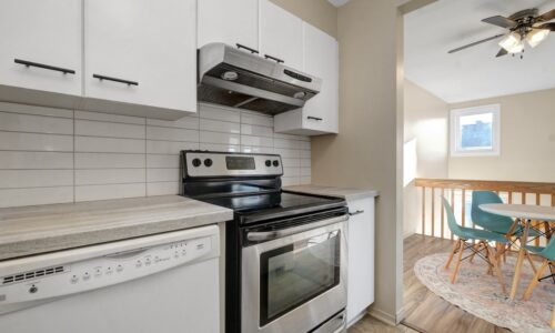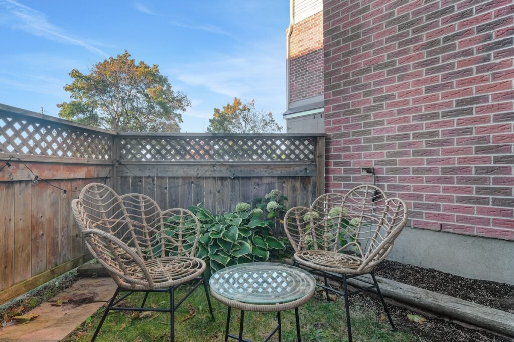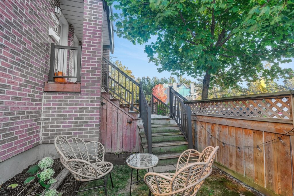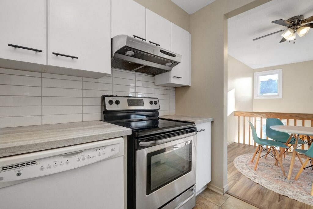 Bright and inviting main foyer landing welcomes you, just a few steps up you’ll find a handy closet for storage, and then a private balcony perfect for enjoying your morning coffee. Light laminate flooring flows throughout the upper level, creating a cohesive and airy feel. The spacious and bright living area features a large bay window, cozy wood-burning fireplace, and a skylight that adds a unique touch and extra natural sunlight. The charming open dining area connects seamlessly to both the living room and landing, with open sightlines over the stairs enhancing the sense of space. Kitchen combines timeless design with modern details, offering sleek white flat-panel cabinetry, stylish black hardware, a stainless steel sink & faucet, and classic stacked white tile backsplash. Generously sized bedroom provides a relaxing retreat, while the full bathroom features light grey flooring, a shower/tub combination and a trendy light fixture. Convenient laundry & utility room with room for storage. Private fenced in outdoor space accessible from front steps, providing a cozy spot to unwind and enjoy the fresh air.
