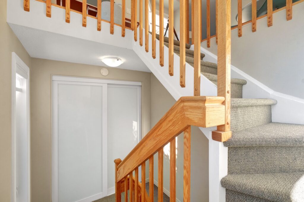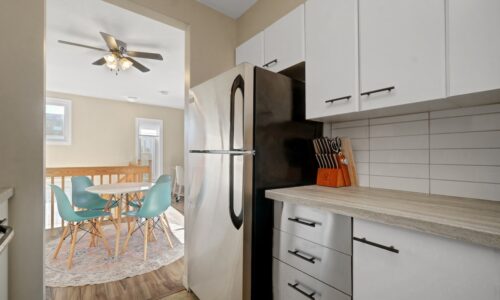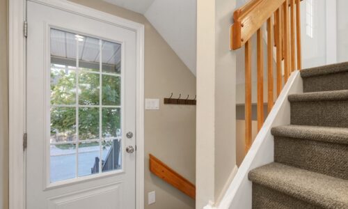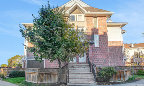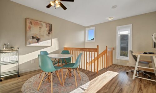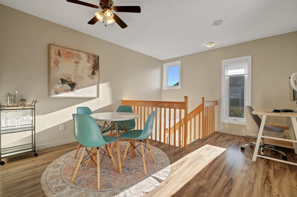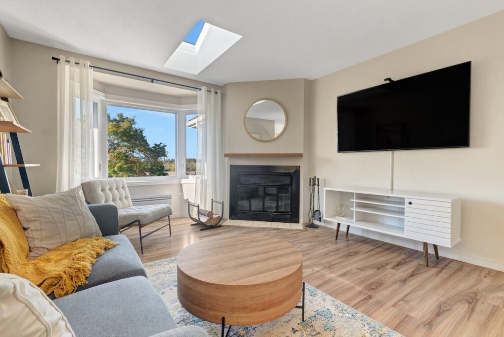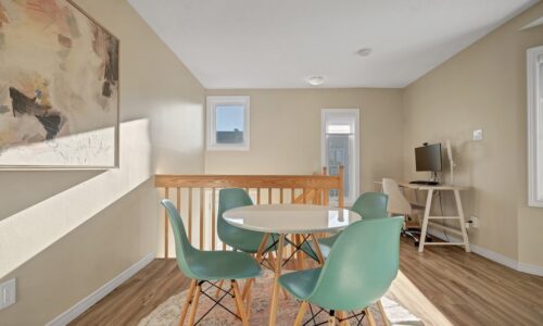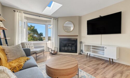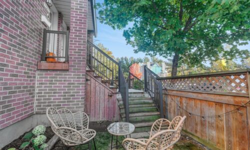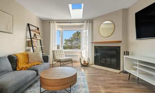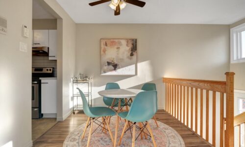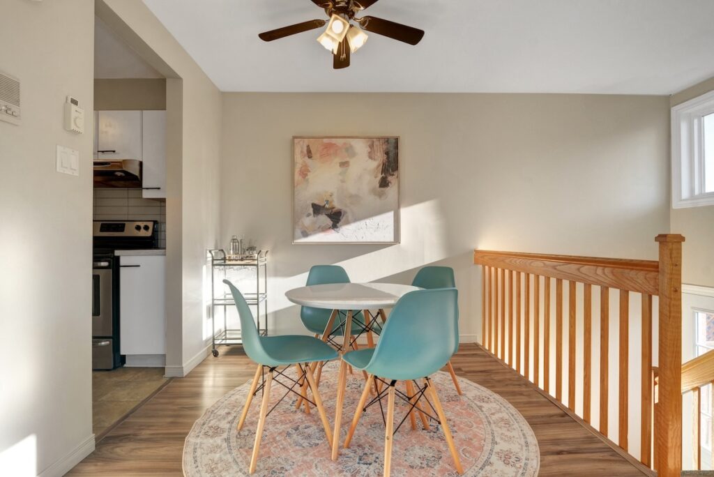 Bright and inviting main foyer landing welcomes you, just a few steps up you’ll find a handy closet for storage, and then a private balcony perfect for enjoying your morning coffee. Light laminate flooring flows throughout the upper level, creating a cohesive and airy feel. The spacious and bright living area features a large bay window, cozy wood-burning fireplace, and a skylight that adds a unique touch and extra natural sunlight. The charming open dining area connects seamlessly to both the living room and landing, with open sightlines over the stairs enhancing the sense of space. Kitchen combines timeless design with modern details, offering sleek white flat-panel cabinetry, stylish black hardware, a stainless steel sink & faucet, and classic stacked white tile backsplash. Generously sized bedroom provides a relaxing retreat, while the full bathroom features light grey flooring, a shower/tub combination and a trendy light fixture. Convenient laundry & utility room with room for storage. Private fenced in outdoor space accessible from front steps, providing a cozy spot to unwind and enjoy the fresh air.
