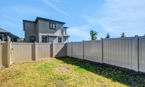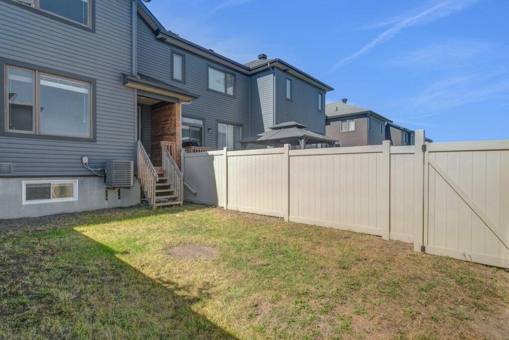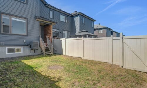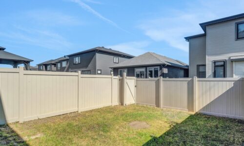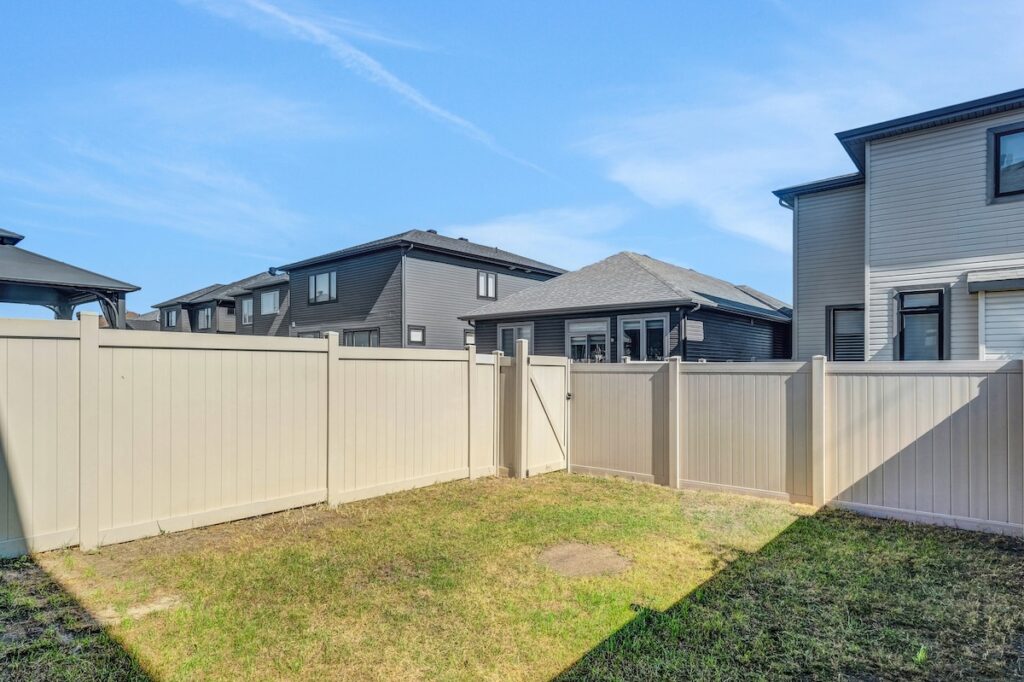 The fully fenced backyard offers a private and versatile outdoor space, with a grassy lawn and covered back exit that adds a sense of privacy.