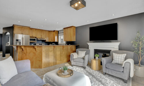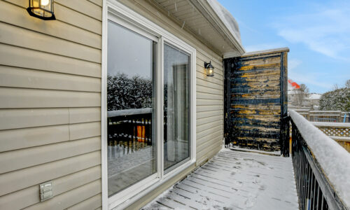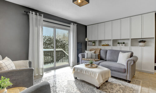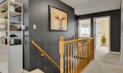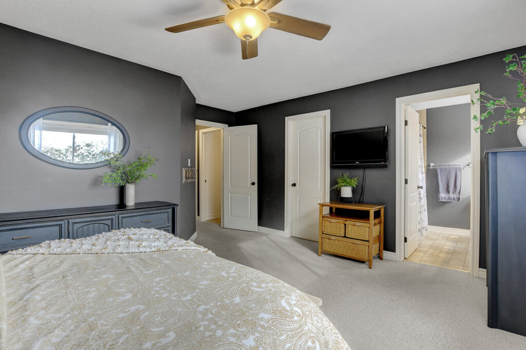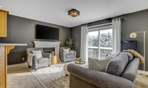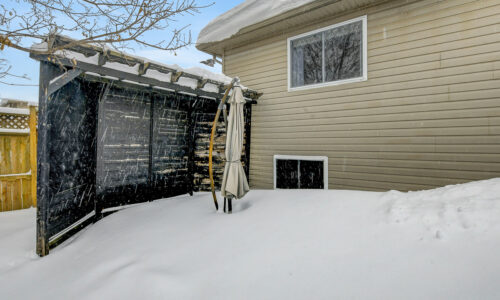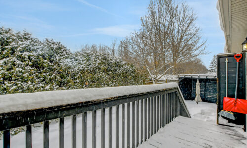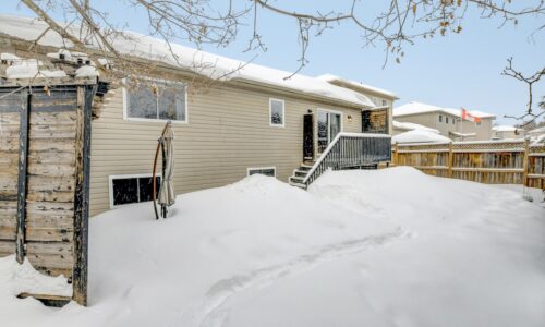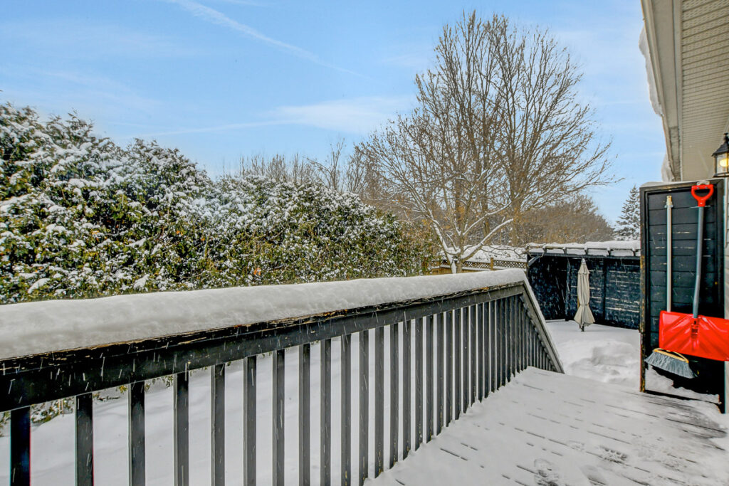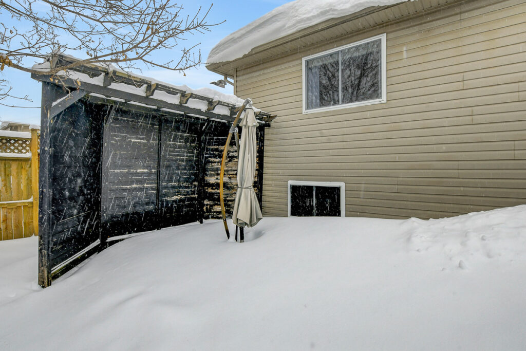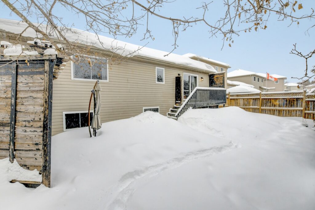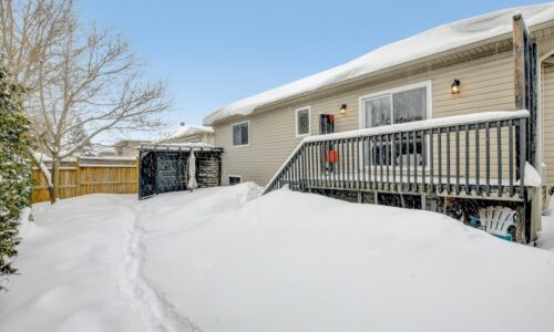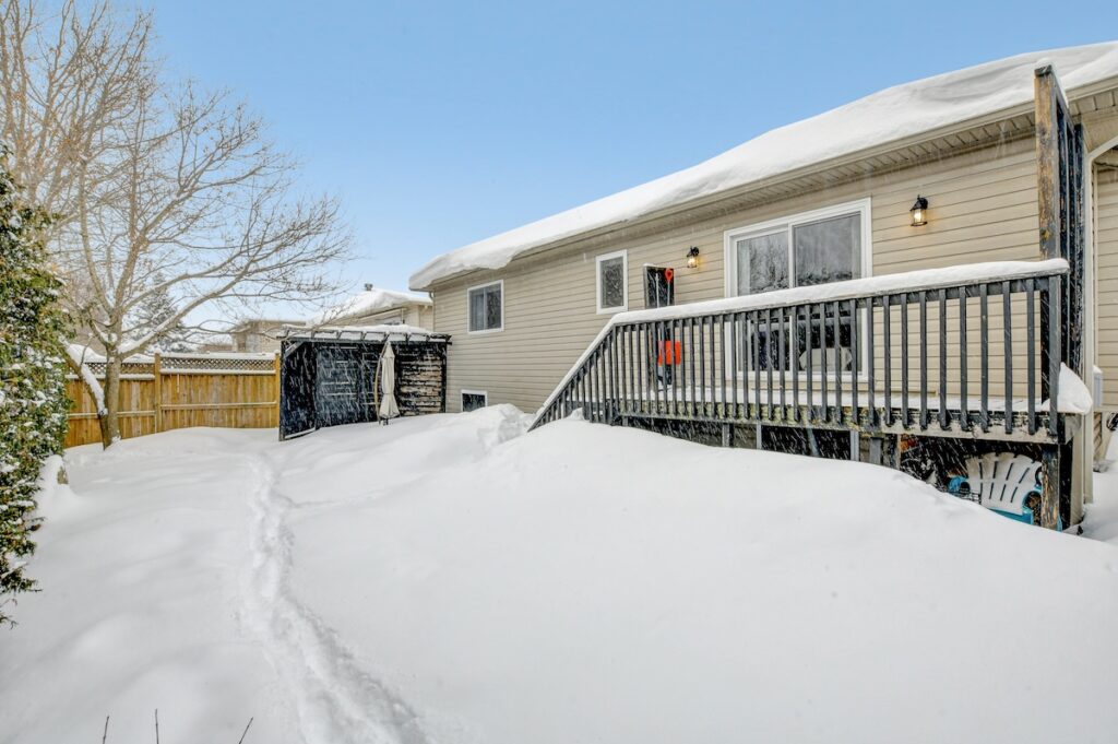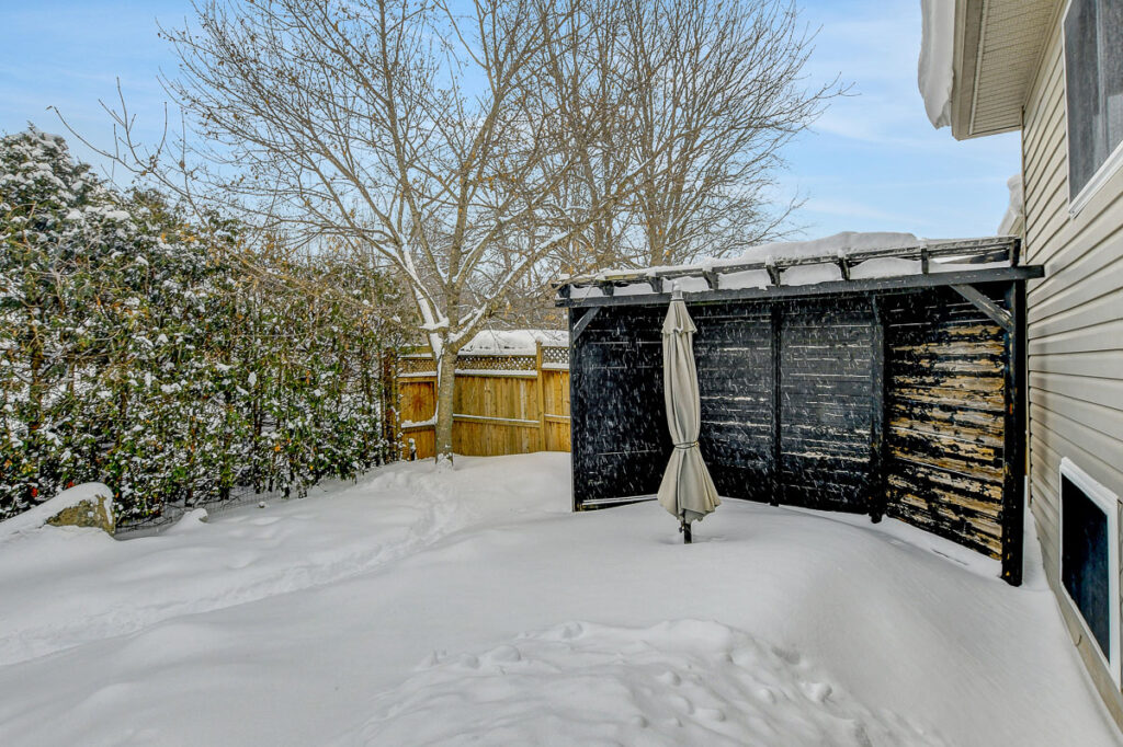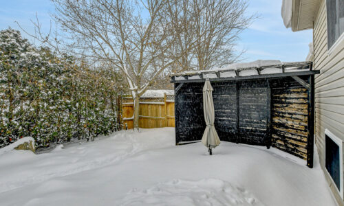 Effortless outdoor living with a main level walk-out deck leading into a fully fenced backyard lined with mature foliage for privacy. Low-maintenance, no-grass landscaping featuring a 13×13 patio & privacy wall.