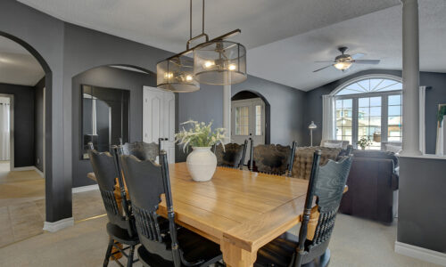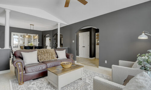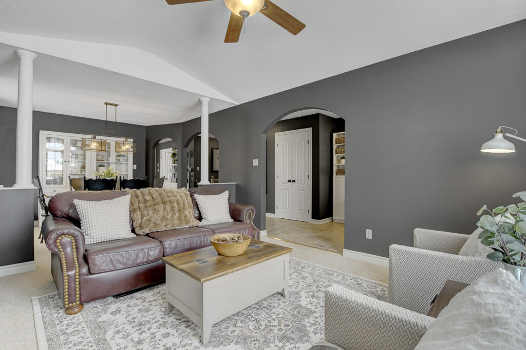 Striking full brick front, covered entry and double attached garage create superb curb appeal. Generous foyer entrance leads into the front formal living room with an arched window & vaulted ceiling. Living room opens gracefully to the dining area with architectural half-walls & classic columns. Open-concept kitchen & family room are perfectly suited for everyday living. Kitchen features maple cabinetry finished with crown moulding, a large peninsula island with overhang seating & abundant storage. Family room is anchored by a gas fireplace and offers direct access to the backyard. Spacious primary bedroom feels like a retreat with a private ensuite + walk-in closet. Two additional main level bedrooms and a second full bath. Downstairs, a partially finished basement – just missing the finished ceiling, opens into a long bright recreation room and storage space, flowing into a suite with 2 bedrooms, a living space, and a partial bathroom with roughed-in plumbing and mostly built-out shower. This area is also ideal for quiet work-from-home offices or hobby spaces.