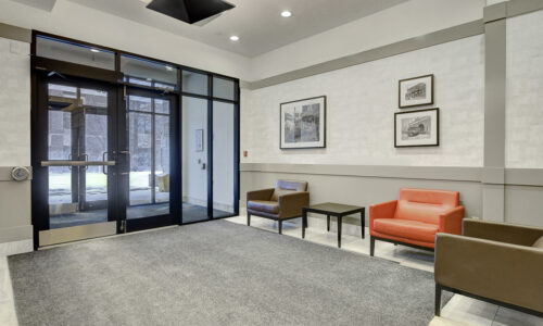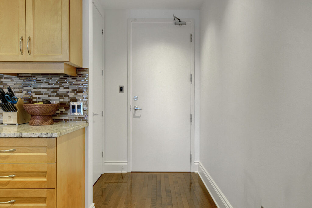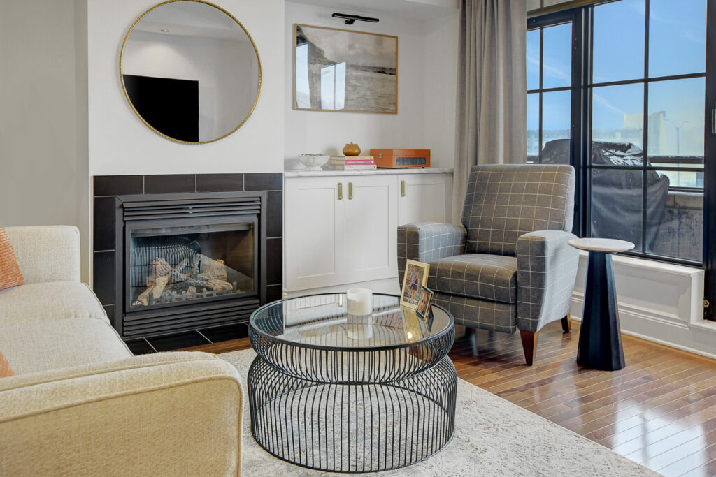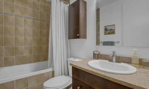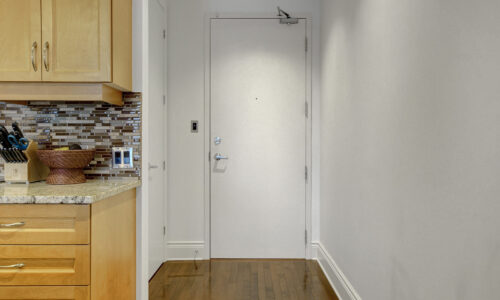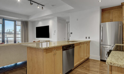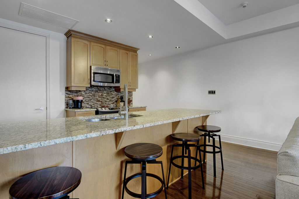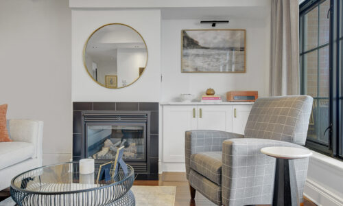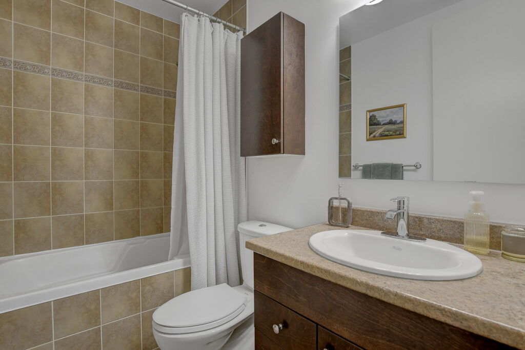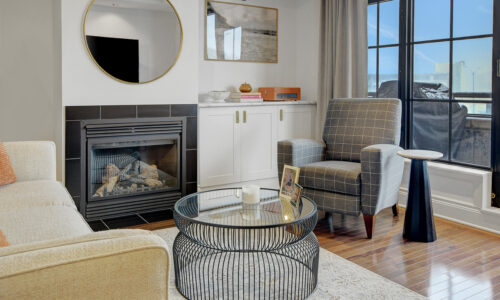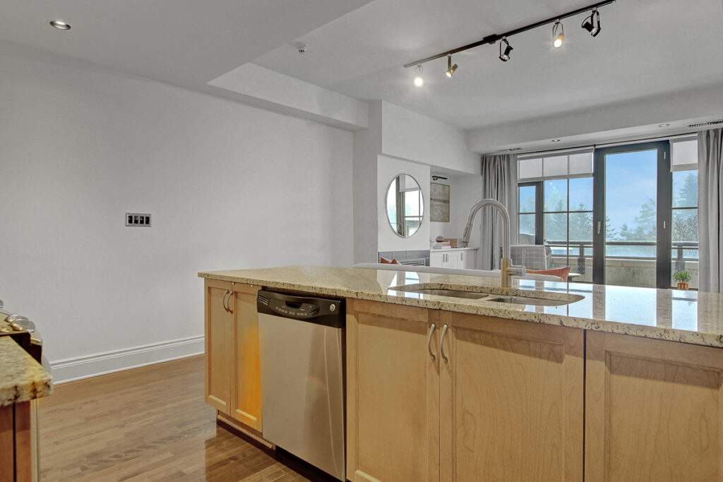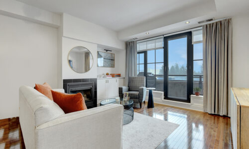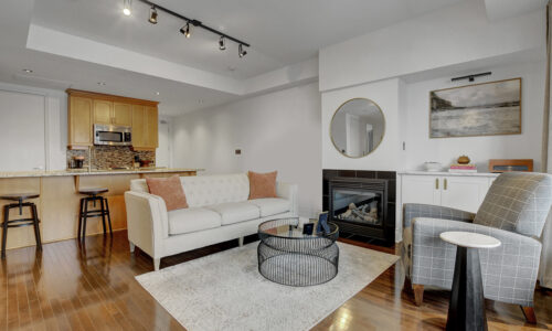 Well-proportioned & thoughtfully designed – 2 bedroom, 2 bathroom condo delivers comfort and sophistication in a great mid-size building. White walls, sleek black accents & rich dark hardwood floors create a timeless and polished look. Open-concept heart of the home is ideal for both everyday living & entertaining. Living room anchored by a cozy gas fireplace & a striking wall of windows that flood the space with natural light. Kitchen is impressively sized featuring stainless steel appliances, granite countertops, extended upper cabinetry, and a long peninsula island with overhang seating. Covered balcony off the living area is ideal for relaxing while covered from the elements. Primary bedroom offers a private retreat with its own ensuite bathroom. Second bedroom is located just steps from the main bathroom, giving it the feel of a private ensuite.