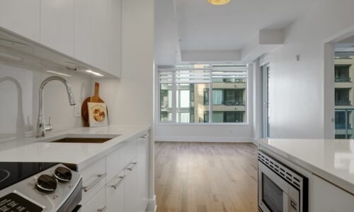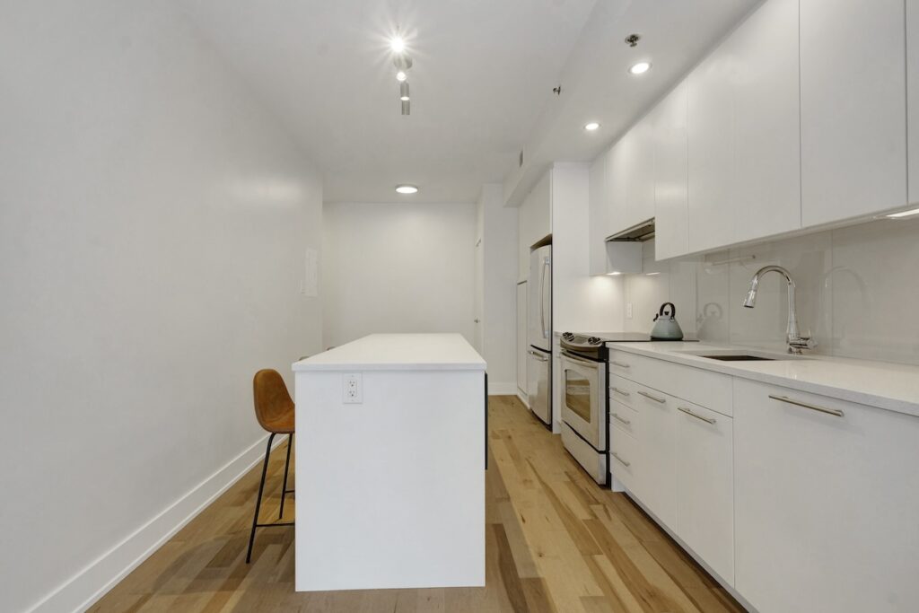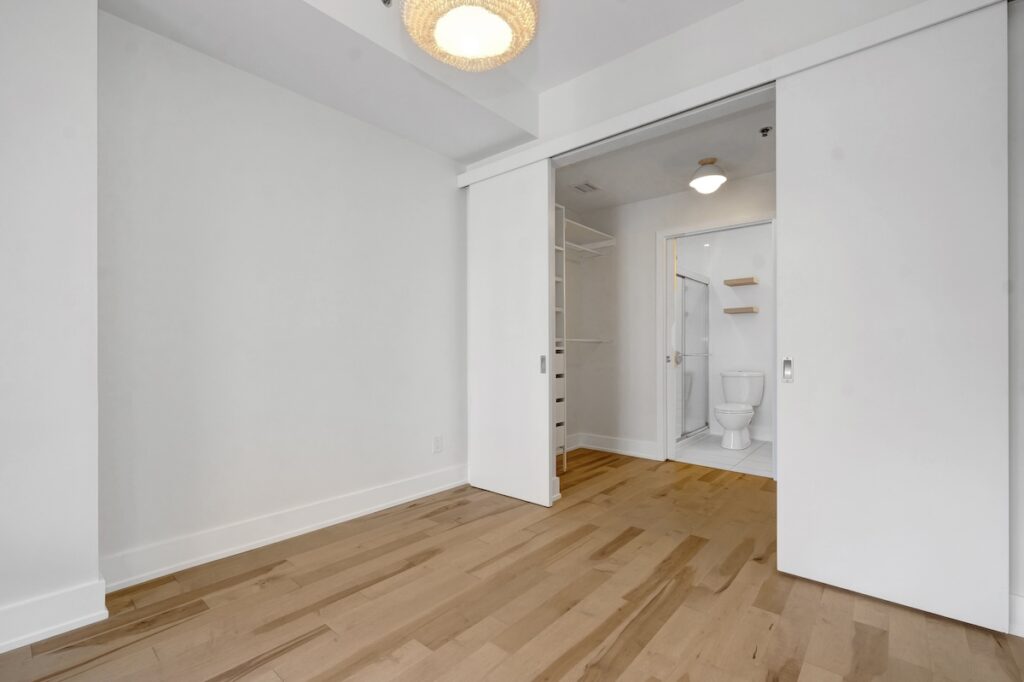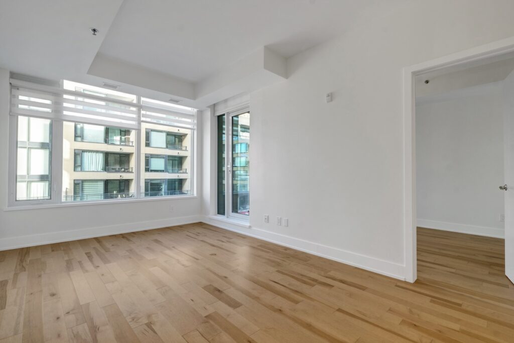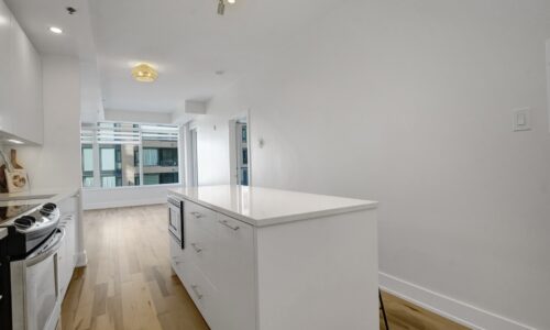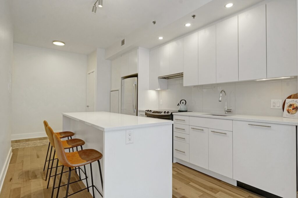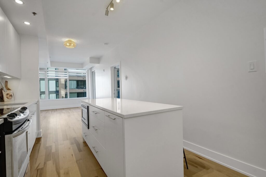 Unit boasts bright contemporary style and is well upgraded from top to bottom. Light engineered hardwood floors, fresh white paint, modern lighting, and minimalist window coverings create a perfectly timeless design. An open-concept layout stretches along a long, airy floorplan anchored by huge windows that flood the home with natural light. The beautiful white kitchen features a centre island with casual seating, quartz countertops, under-cabinet lighting, extended flat-panel cabinetry to the ceiling, sleek stainless-steel appliances, and a polished backsplash. Flowing into a cozy dining area and then to a sunlit living room with access to a covered balcony. Rounding out the main area are a convenient powder room and discreetly tucked-away in-unit laundry. Private primary suite where floor-to-ceiling windows create an inviting retreat complete with a large double-sided walk-in closet featuring a custom organization system, and a full ensuite bathroom with an oversized glass-panelled shower. Unit includes a heated underground parking space B3 and adjacent storage locker B156.