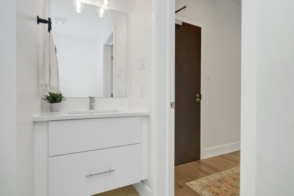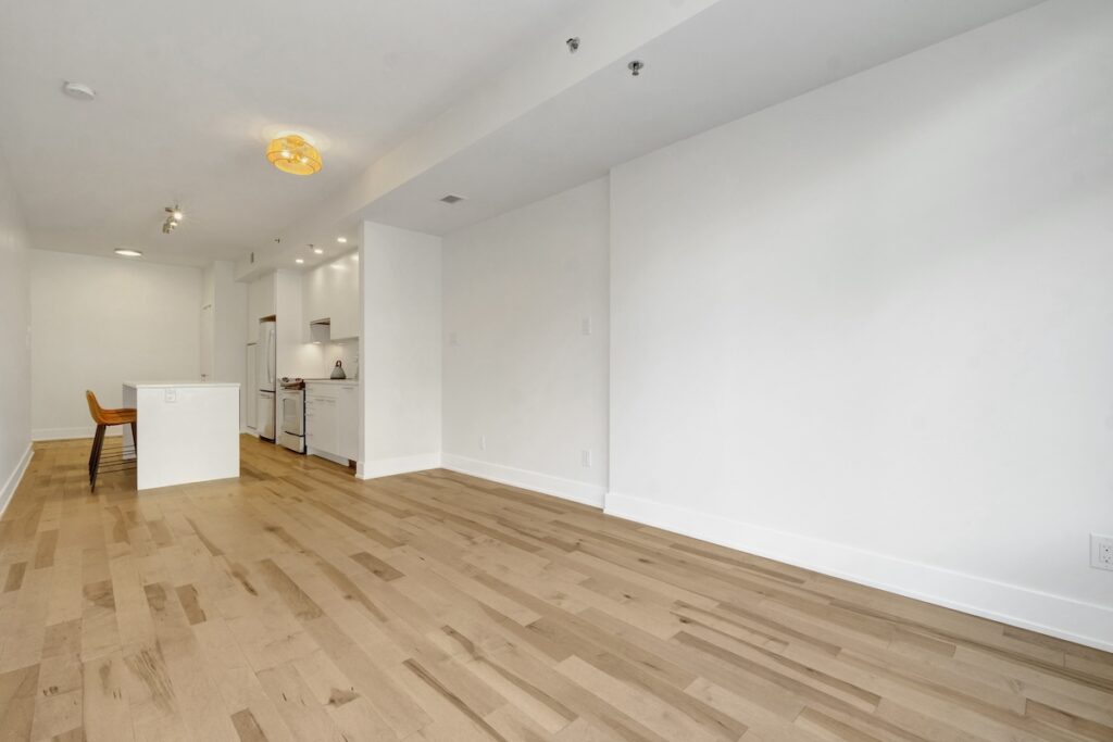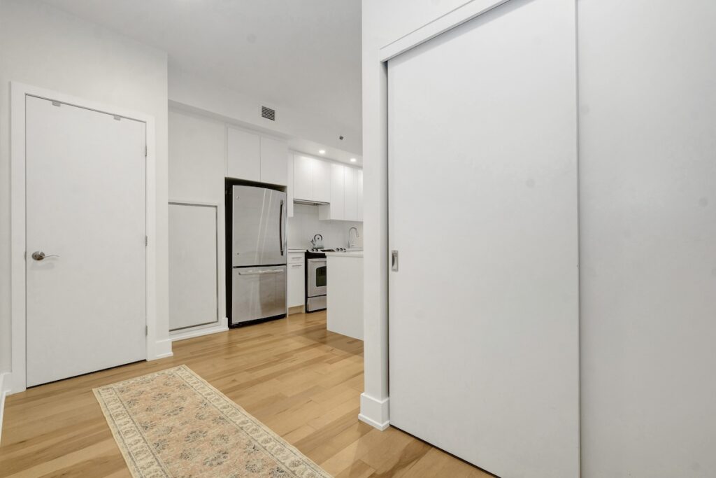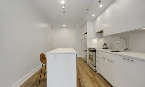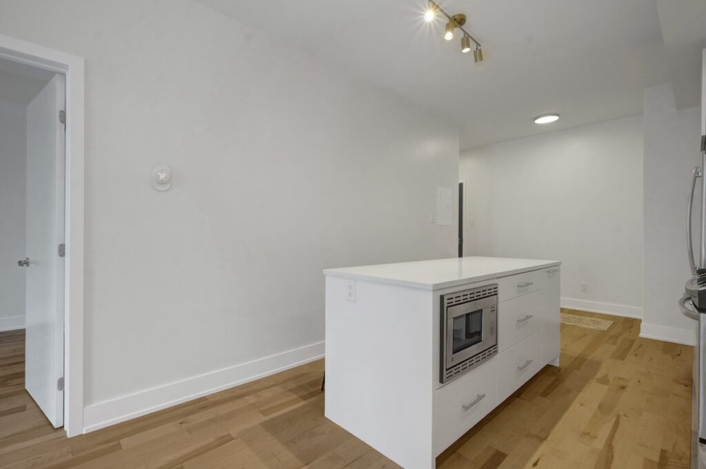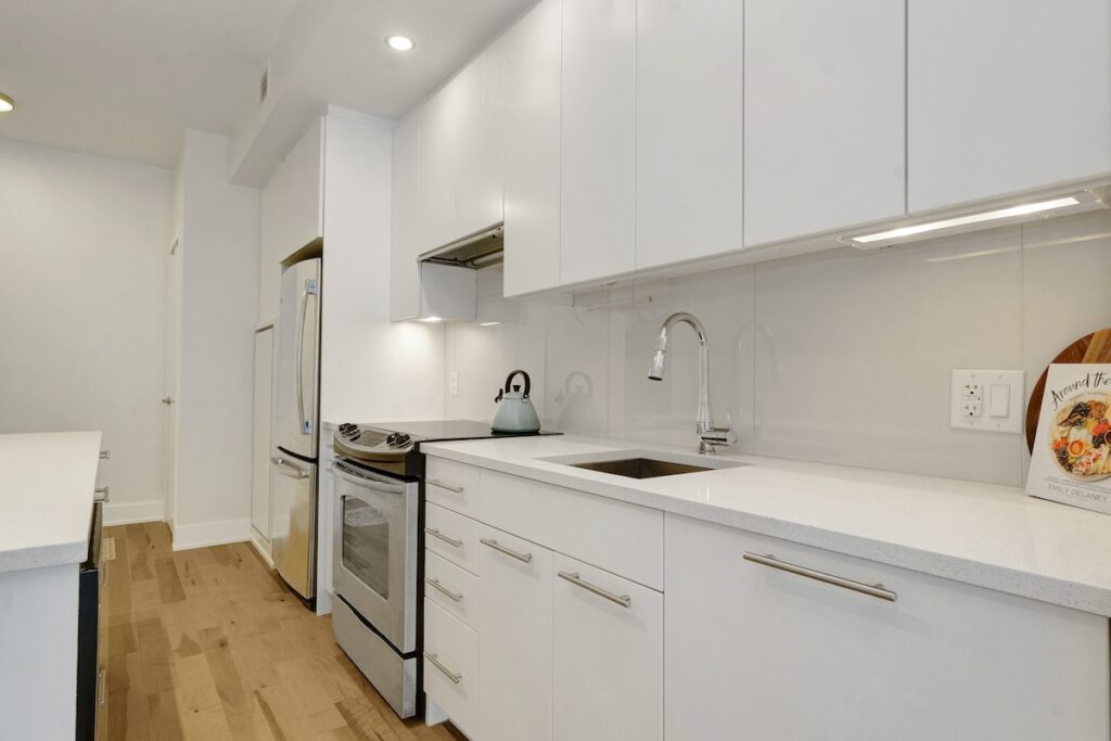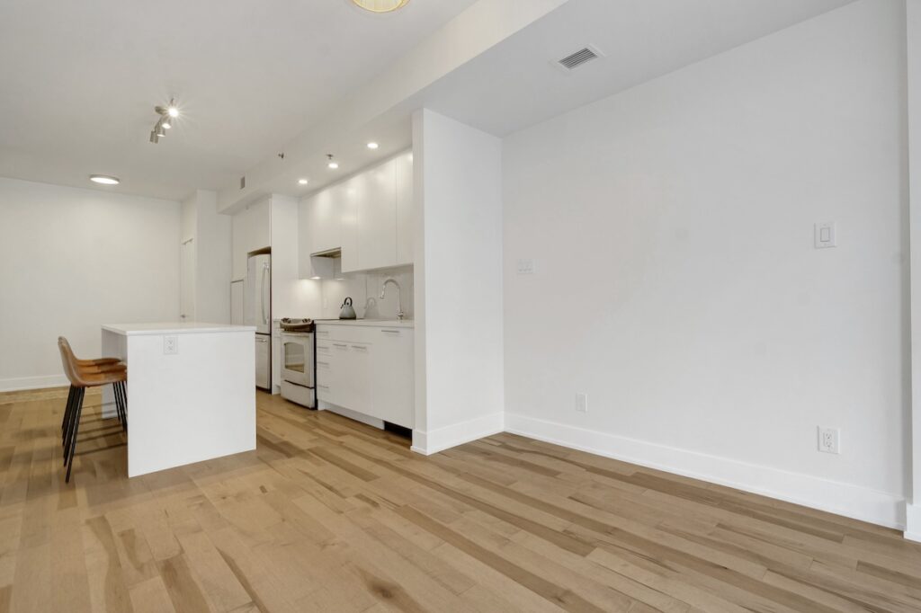 Unit boasts bright contemporary style and is well upgraded from top to bottom. Light engineered hardwood floors, fresh white paint, modern lighting, and minimalist window coverings create a perfectly timeless design. An open-concept layout stretches along a long, airy floorplan anchored by huge windows that flood the home with natural light. The beautiful white kitchen features a centre island with casual seating, quartz countertops, under-cabinet lighting, extended flat-panel cabinetry to the ceiling, sleek stainless-steel appliances, and a polished backsplash. Flowing into a cozy dining area and then to a sunlit living room with access to a covered balcony. Rounding out the main area are a convenient powder room and discreetly tucked-away in-unit laundry. Private primary suite where floor-to-ceiling windows create an inviting retreat complete with a large double-sided walk-in closet featuring a custom organization system, and a full ensuite bathroom with an oversized glass-panelled shower. Unit includes a heated underground parking space B3 and adjacent storage locker B156.