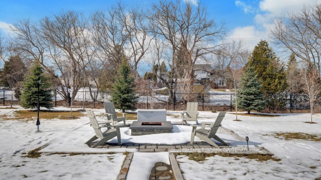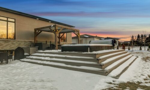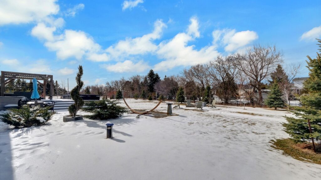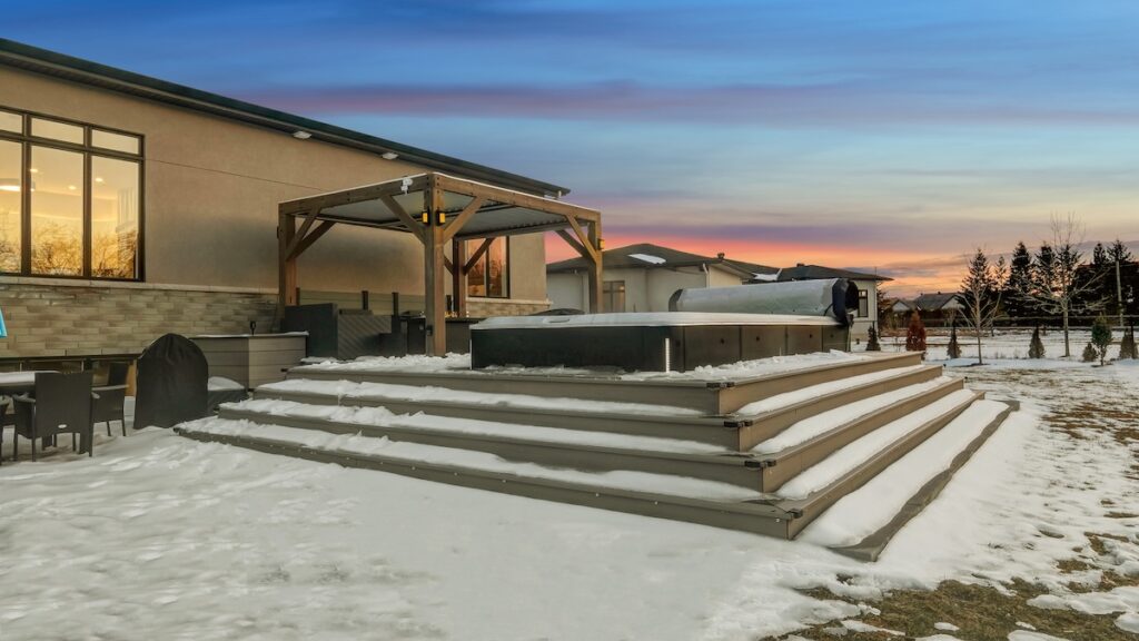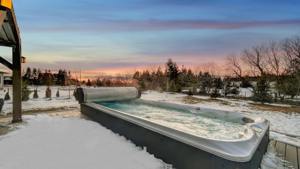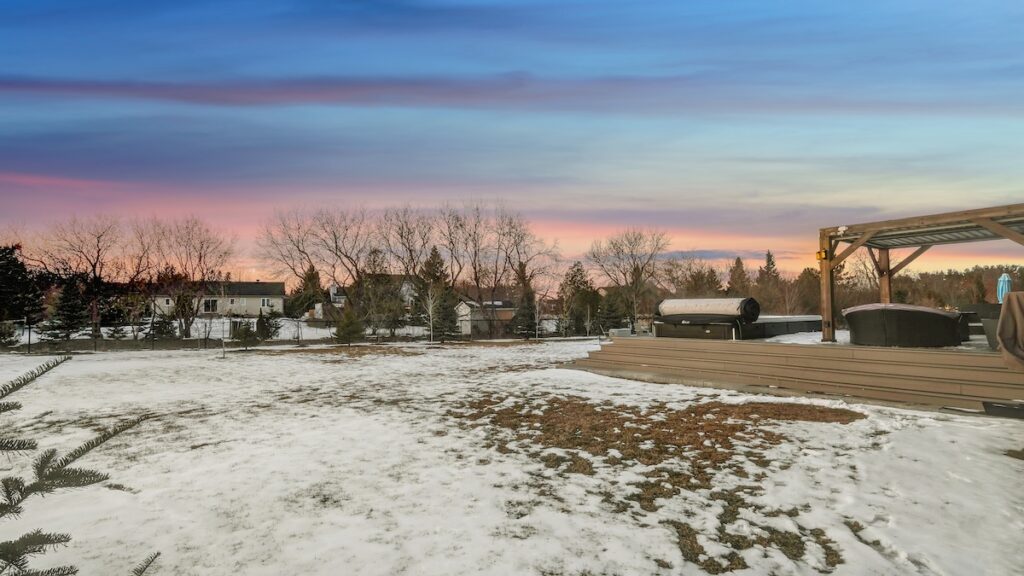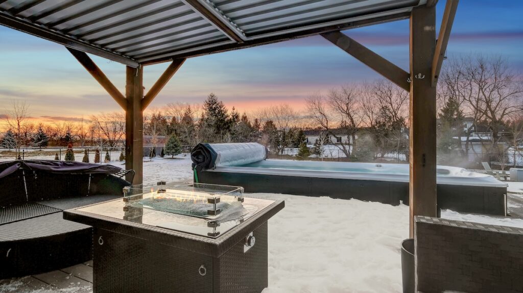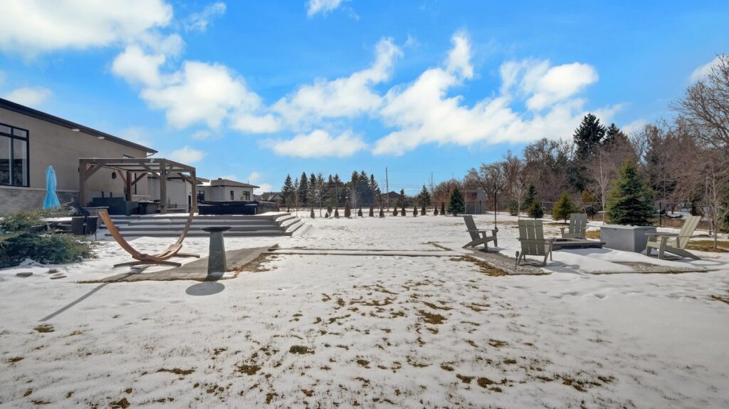Huge backyard acts as a private retreat centered around an XL composite deck with an integrated swim spa for year-round enjoyment. Fully fenced and peppered with trees for privacy, stone patio, firepit area, raised garden beds, irrigation system and multiple seating zones designed to capture sunset views.