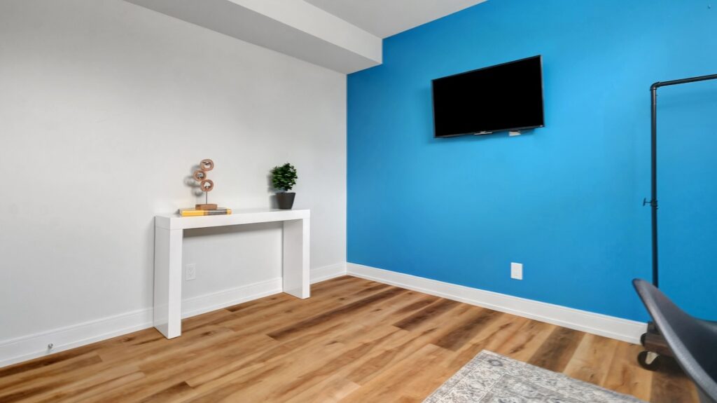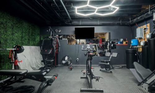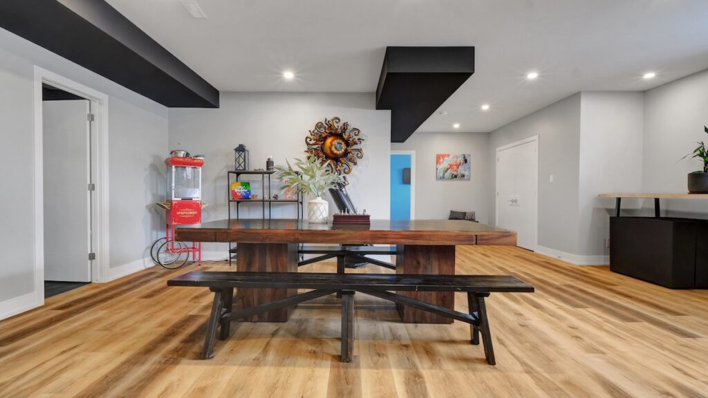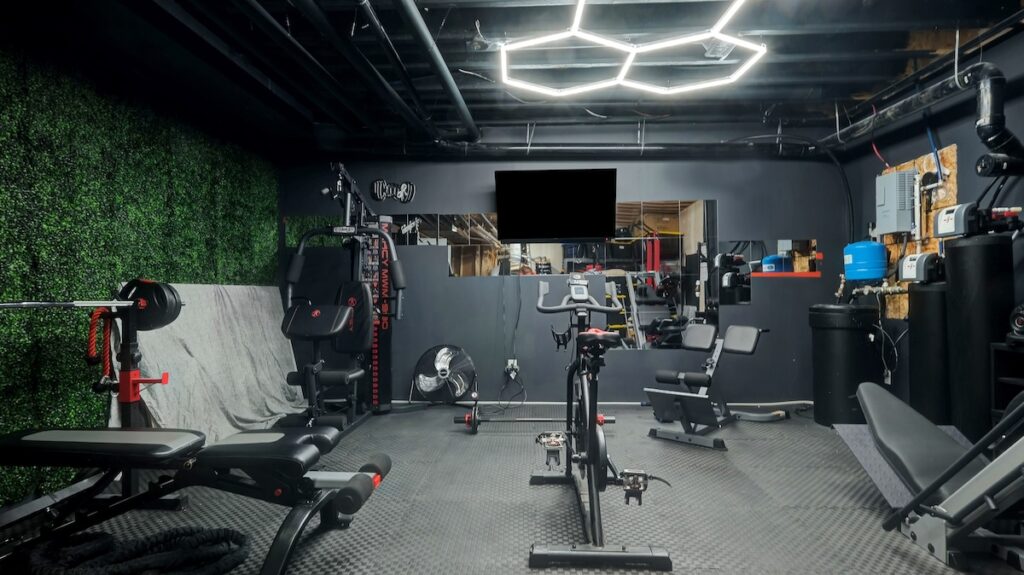 Oversized triple-car garage is fully finished with epoxy flooring, custom lighting, and a Level 2 EV charger.