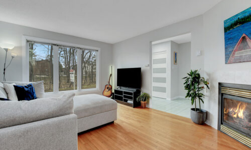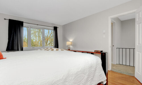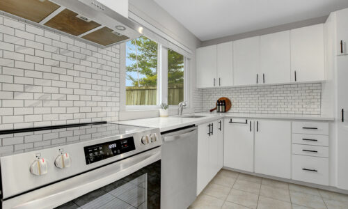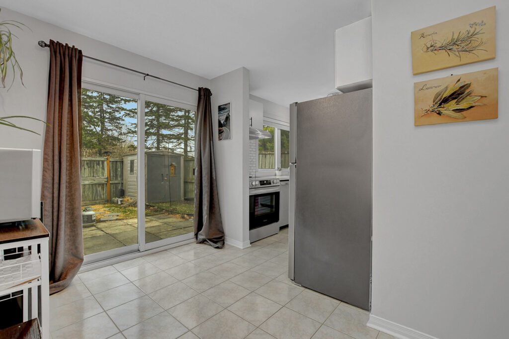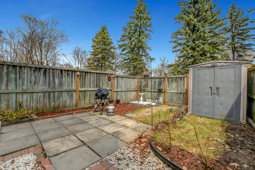 Upstairs, 3 well sized bedrooms await – primary bedroom includes walk in closet + full bathroom tastefully updated. Finished basement extends living space featuring stylish laminate flooring, expansive recreation room with dry bar + additional bathroom. Outside, fully fenced backyard requires minimal landscaping for easy maintenance, stone patio, garden beds, storage shed & gated access to park behind home. In-unit laundry & parking conveniently located near the unit.