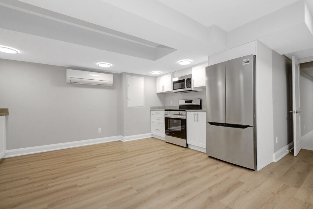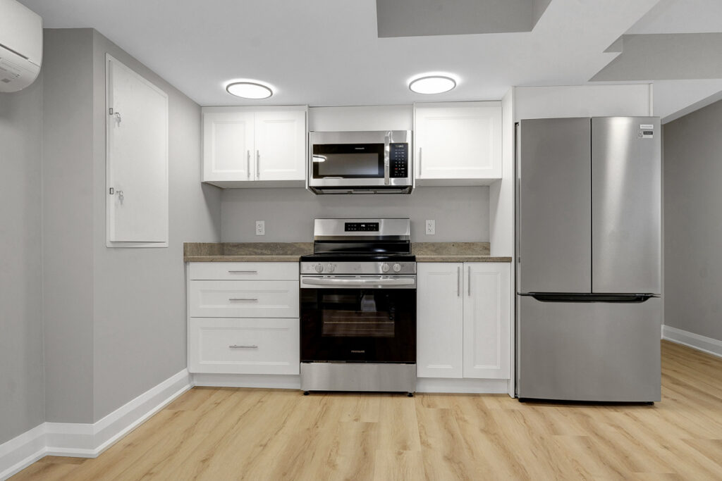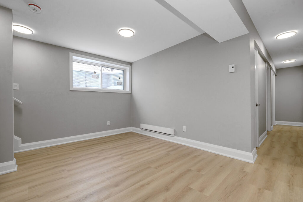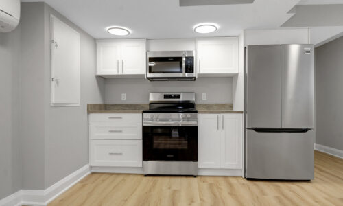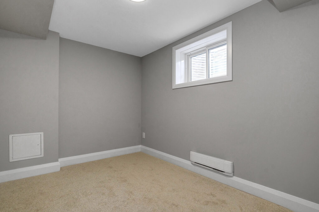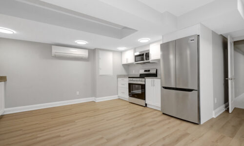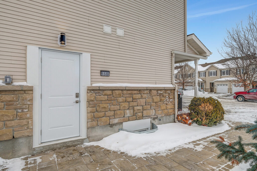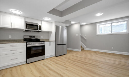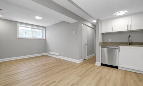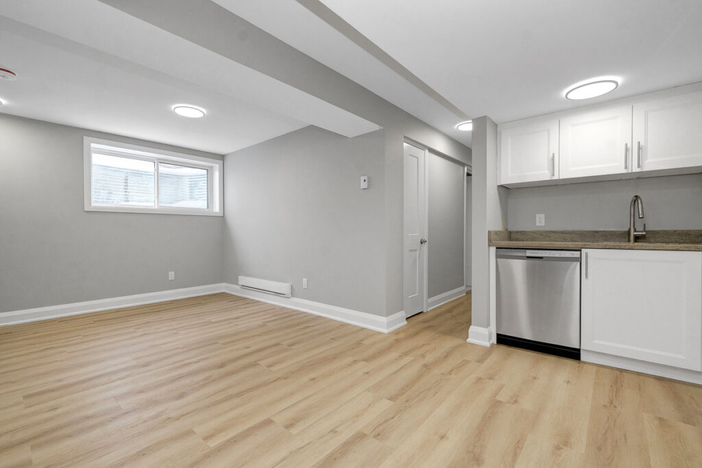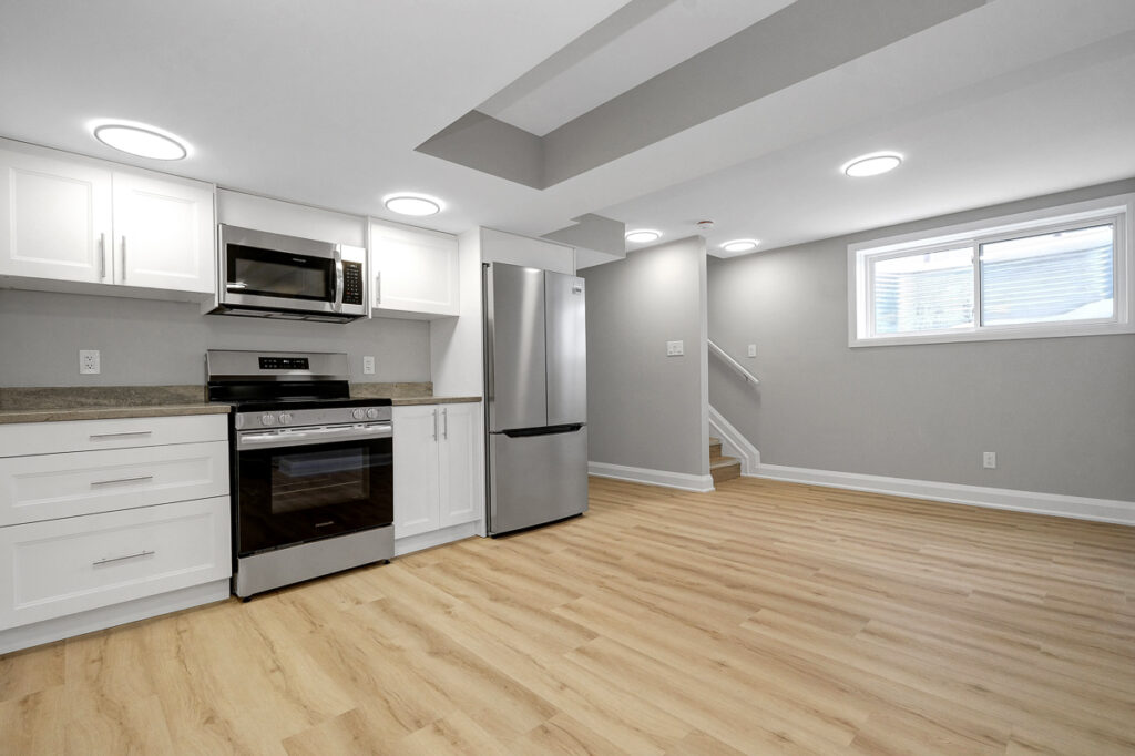Charming stone walkway leads to a private entry around the side of home. Inside, a ground-level foyer with a coat closet keeps things organized. The interior is finished in a fresh, modern palette with light vinyl flooring, neutral grey walls, smooth ceilings, recessed lighting, and large windows that fill the space with natural light. Open-concept main living area flows seamlessly into the kitchen, offering a practical and functional layout. Kitchen is equipped with upgraded stainless steel appliances, classic white shaker cabinetry and granite countertops. Living room is comfortable and versatile, perfect for a cozy sofa setup, TV area, and/or a work-from-home nook. Layout offers three well-proportioned bedrooms, one with a walk-in closet. Full bathroom is finished with oversized tiles that feel clean & contemporary and includes a shower/tub combination. In-unit laundry, and driveway parking is included for one vehicle (possibly two smaller cars).