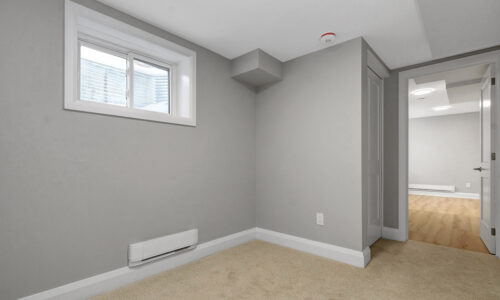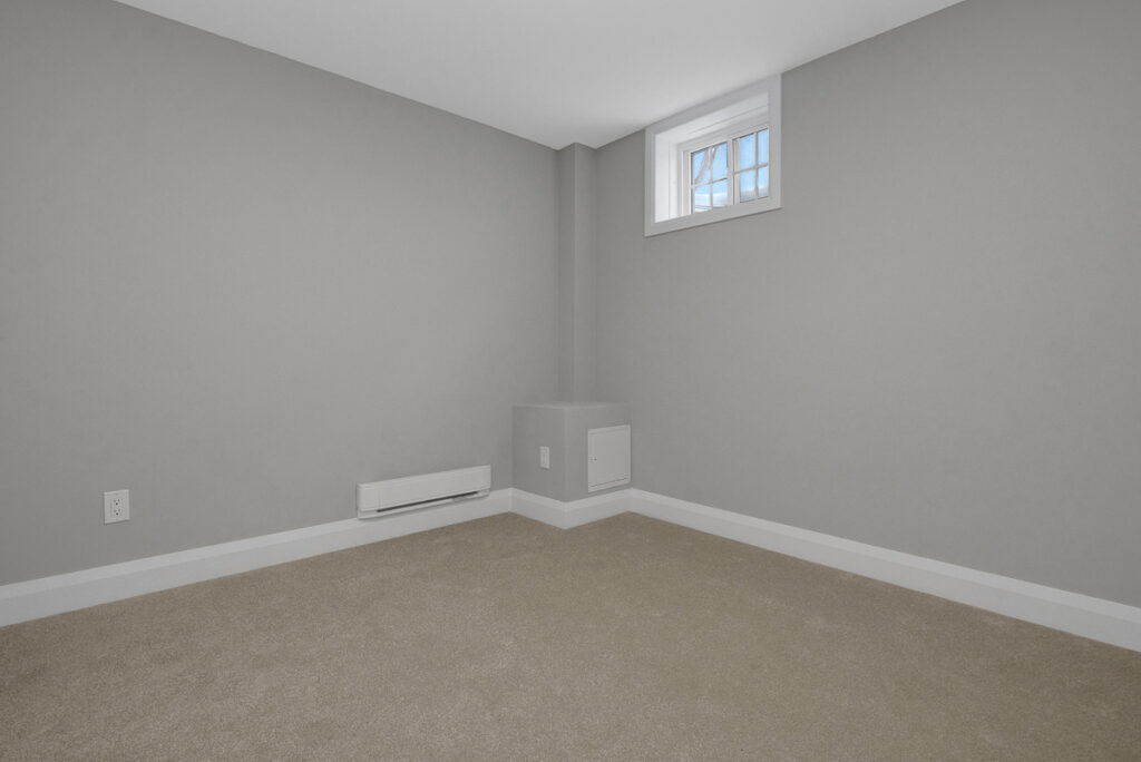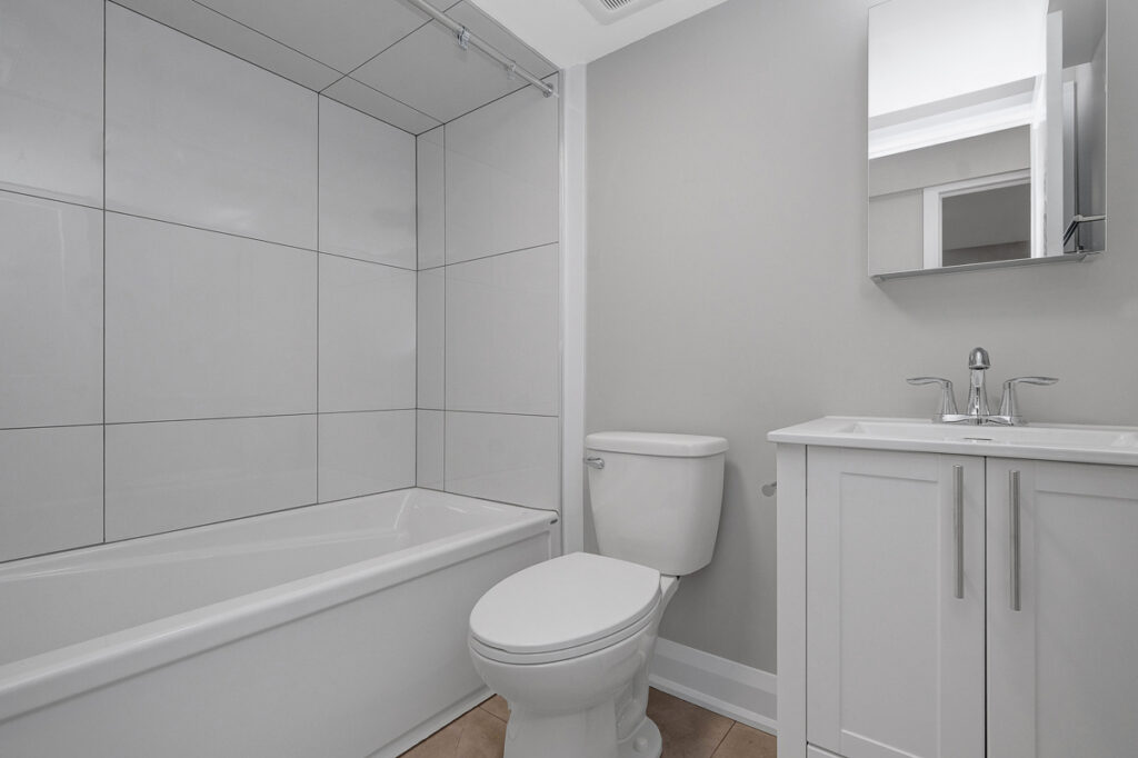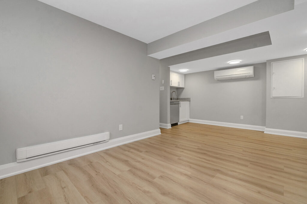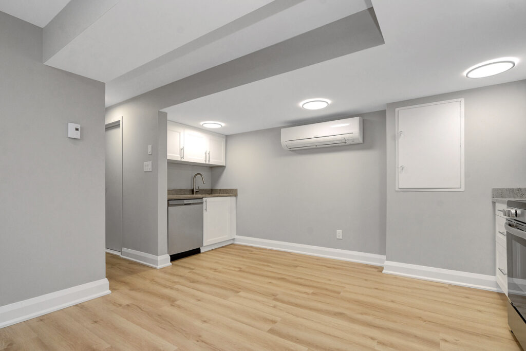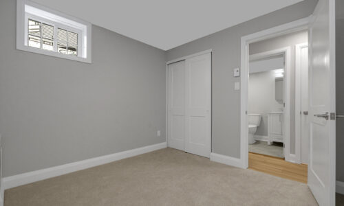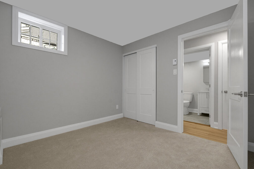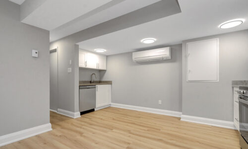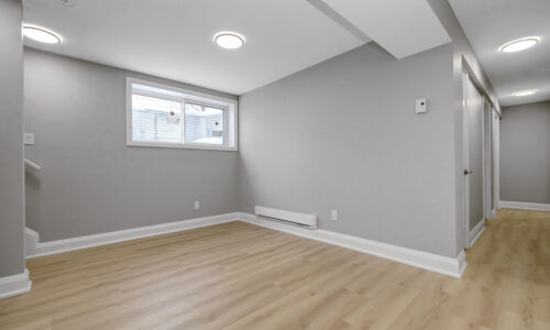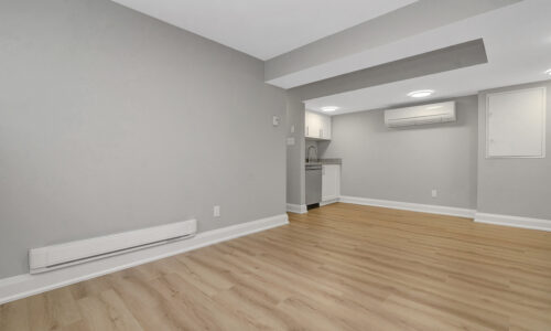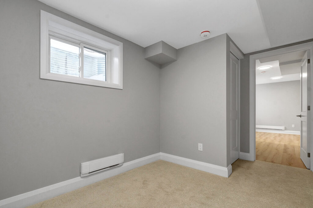 Charming stone walkway leads to a private entry around the side of home. Inside, a ground-level foyer with a coat closet keeps things organized. The interior is finished in a fresh, modern palette with light vinyl flooring, neutral grey walls, smooth ceilings, recessed lighting, and large windows that fill the space with natural light. Open-concept main living area flows seamlessly into the kitchen, offering a practical and functional layout. Kitchen is equipped with upgraded stainless steel appliances, classic white shaker cabinetry and granite countertops. Living room is comfortable and versatile, perfect for a cozy sofa setup, TV area, and/or a work-from-home nook. Layout offers three well-proportioned bedrooms, one with a walk-in closet. Full bathroom is finished with oversized tiles that feel clean & contemporary and includes a shower/tub combination. In-unit laundry, and driveway parking is included for one vehicle (possibly two smaller cars).