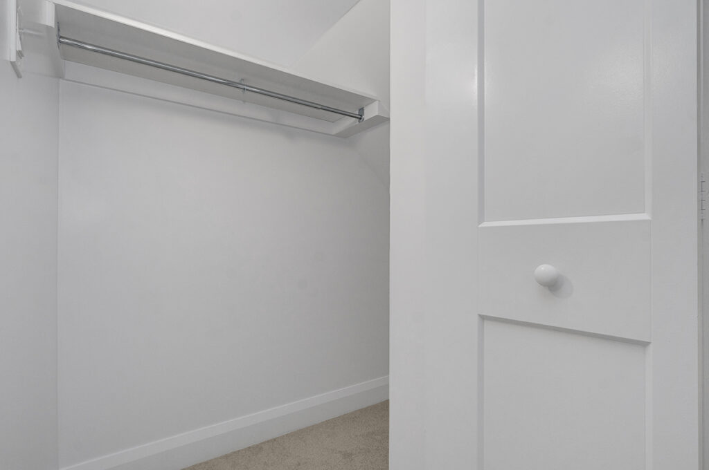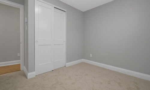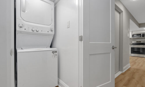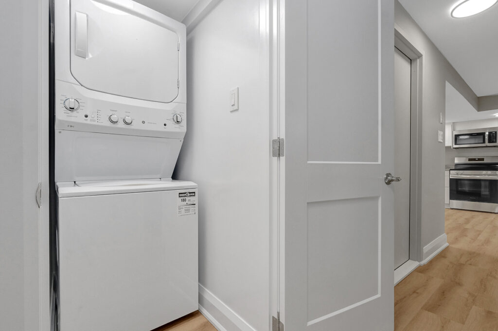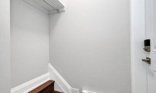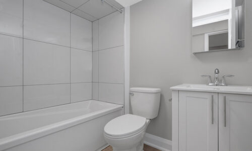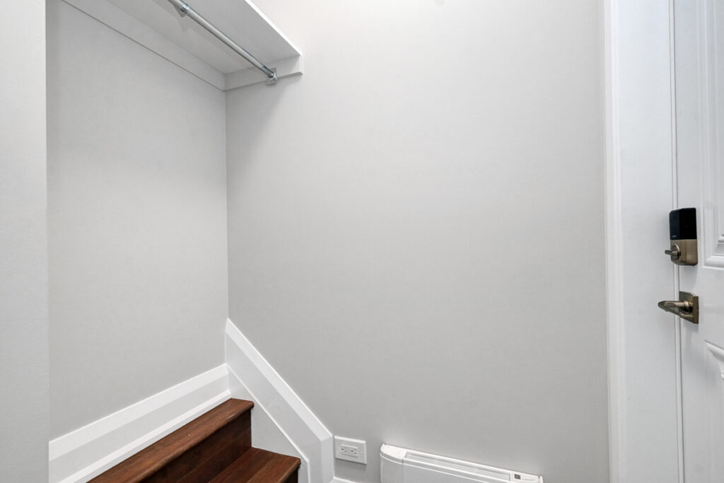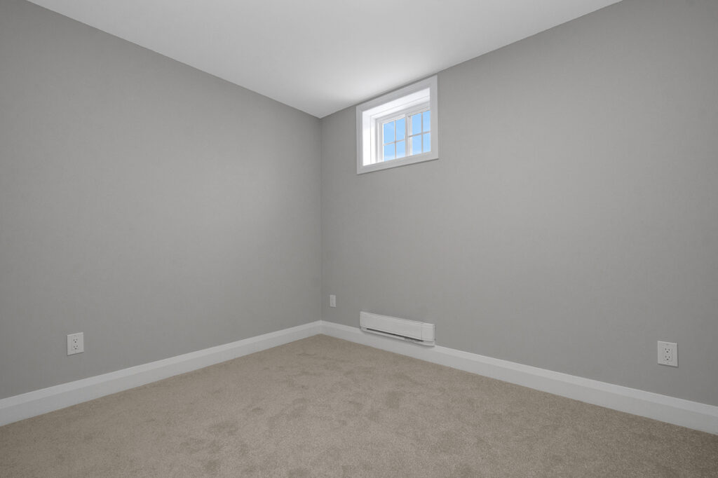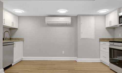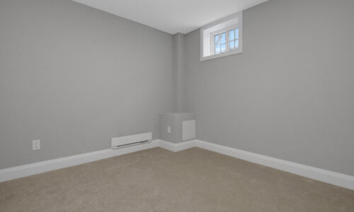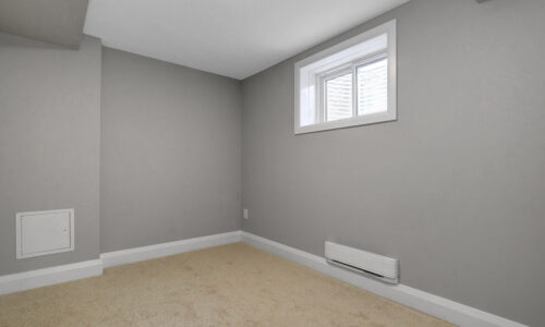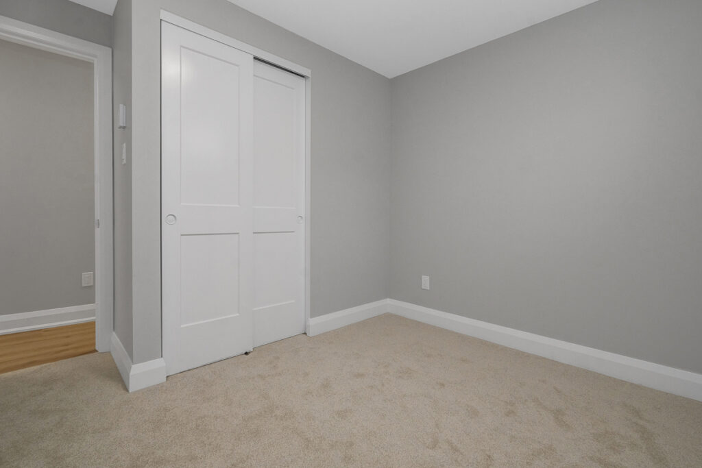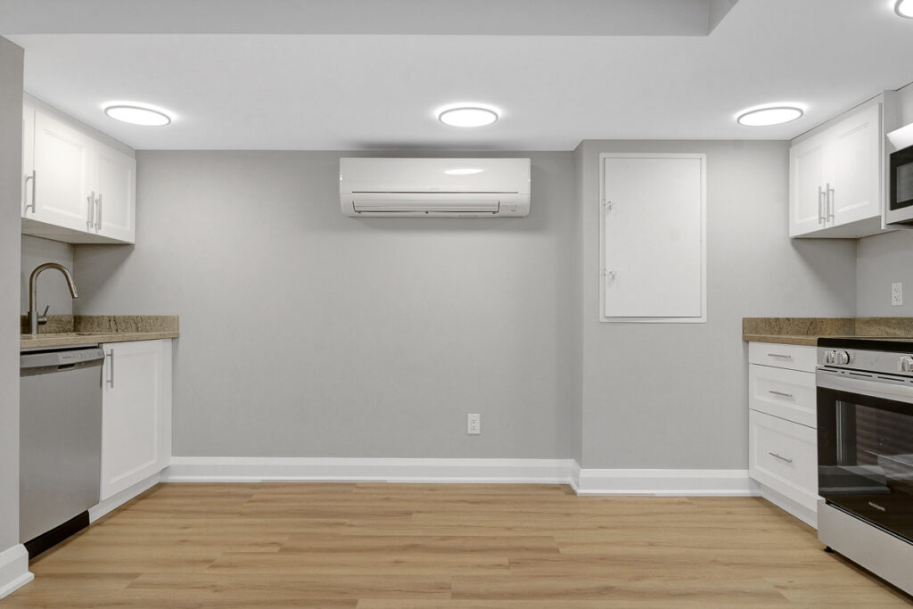Charming stone walkway leads to a private entry around the side of home. Inside, a ground-level foyer with a coat closet keeps things organized. The interior is finished in a fresh, modern palette with light vinyl flooring, neutral grey walls, smooth ceilings, recessed lighting, and large windows that fill the space with natural light. Open-concept main living area flows seamlessly into the kitchen, offering a practical and functional layout. Kitchen is equipped with upgraded stainless steel appliances, classic white shaker cabinetry and granite countertops. Living room is comfortable and versatile, perfect for a cozy sofa setup, TV area, and/or a work-from-home nook. Layout offers three well-proportioned bedrooms, one with a walk-in closet. Full bathroom is finished with oversized tiles that feel clean & contemporary and includes a shower/tub combination. In-unit laundry, and driveway parking is included for one vehicle (possibly two smaller cars).