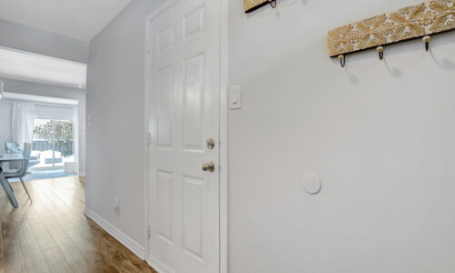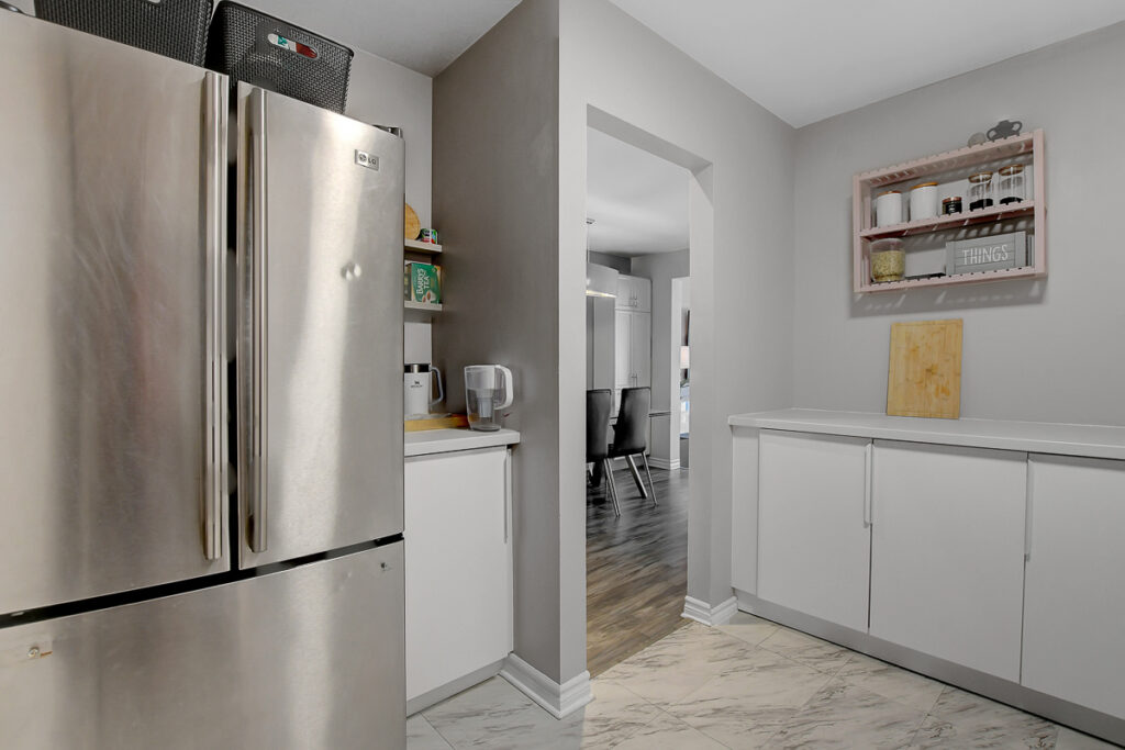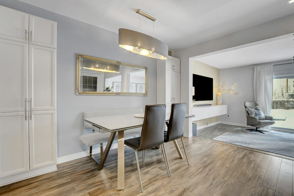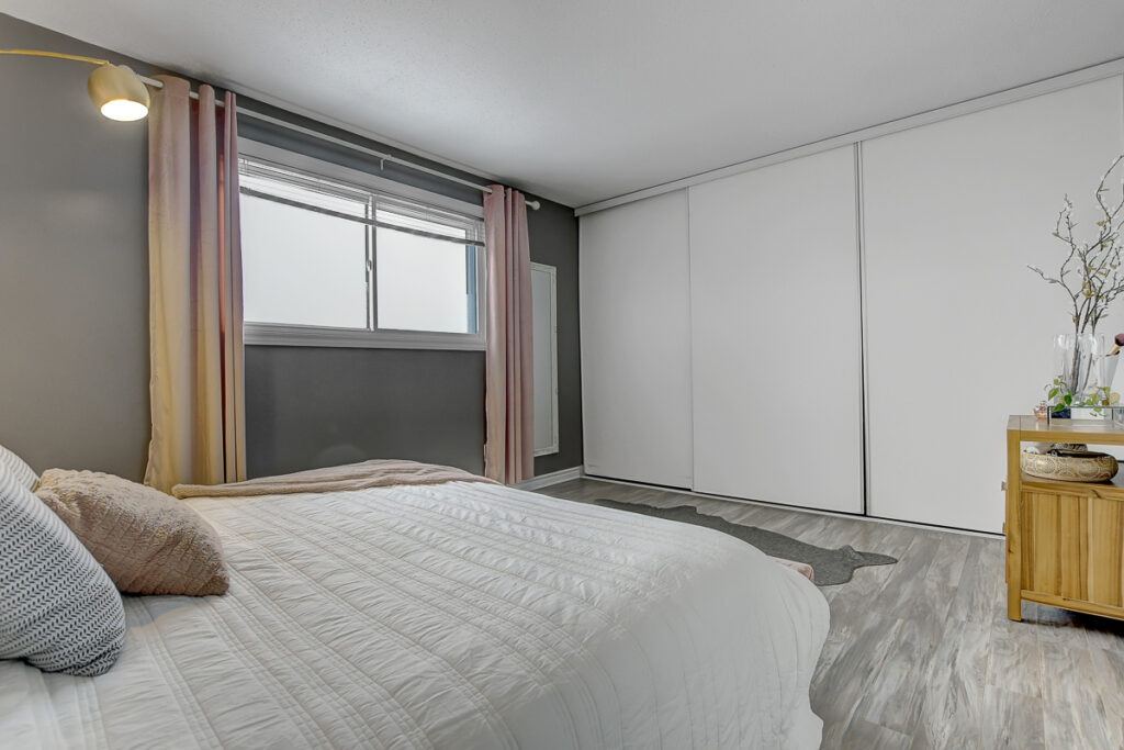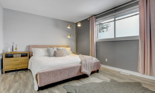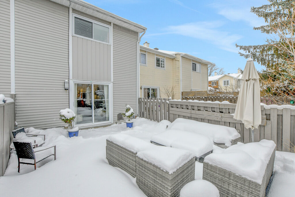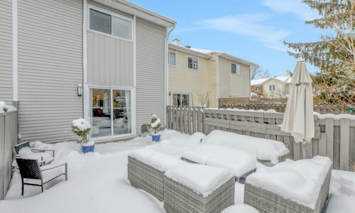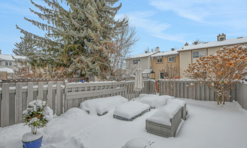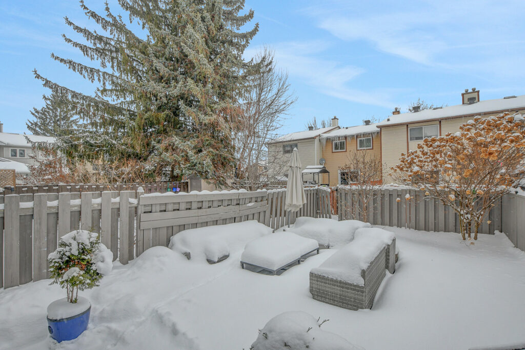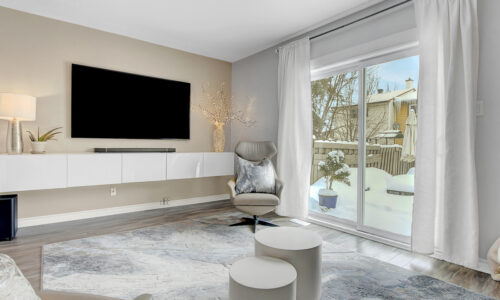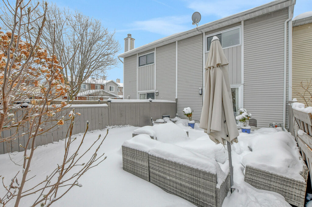 Foyer offers a comfortable space to settle in, opening to a home finished in a cool, subdued colour palette that feels tranquil & refined. Mid-tone laminate flooring runs throughout most of the home for a clean, fresh aesthetic. Crisp white kitchen features modern smooth-front cabinetry, white countertops, a delicate backsplash, and tons of storage & cooking space. Just steps from the dining area, entertaining is easy and effortless. Living room feels tucked away and comfortable, highlighted by a built-in floating media console. Patio doors open directly to the fully fenced backyard, boasting a wood landing/BBQ deck, stone patio, and lush foliage. Primary suite is generously sized with a large wall-to-wall closet and convenient cheater access to the main bathroom. Two additional bedrooms are complemented by an updated full bath that feels truly luxe.