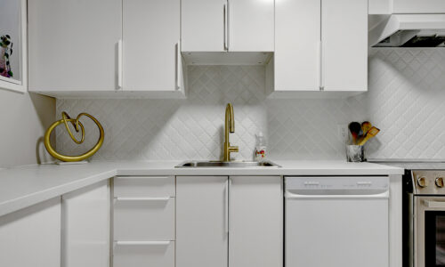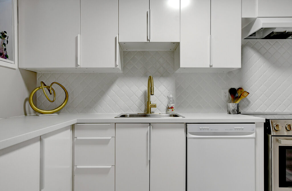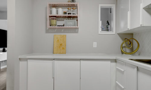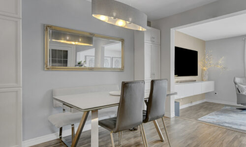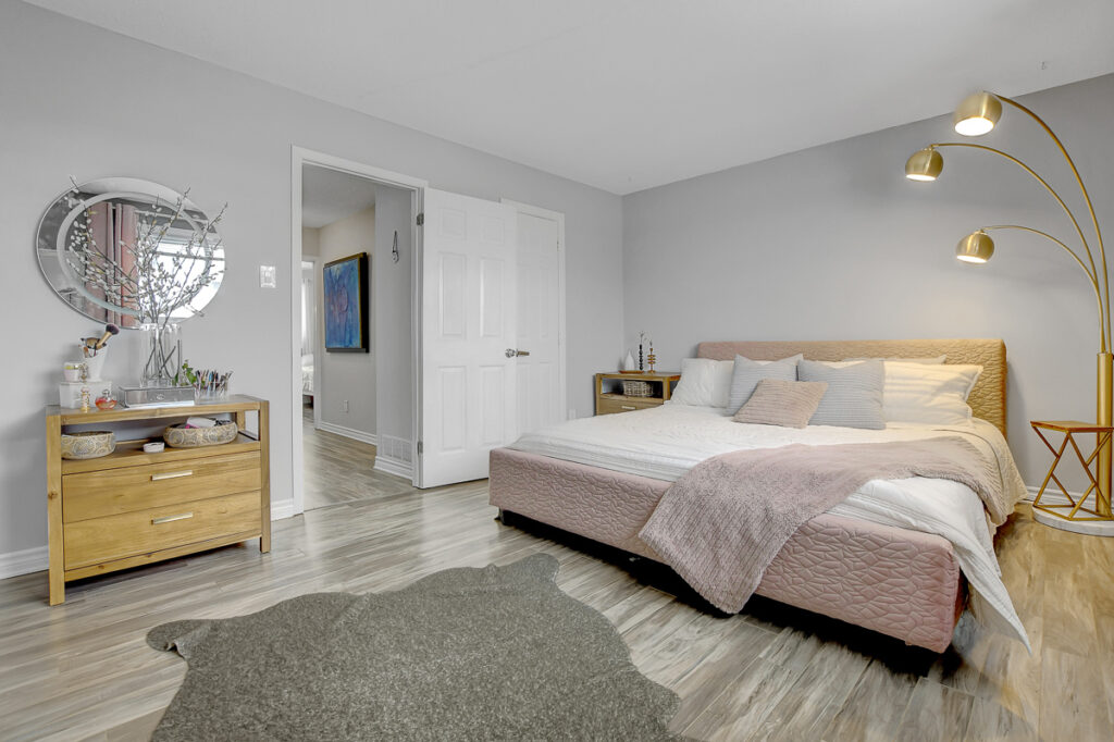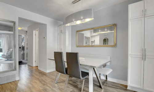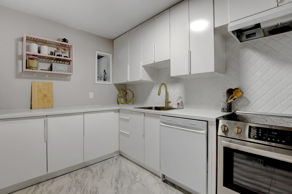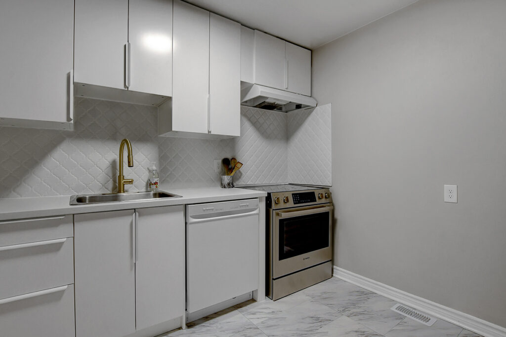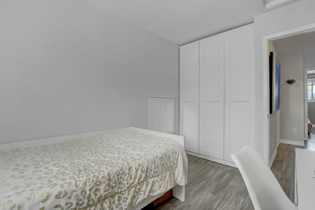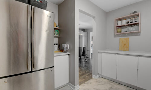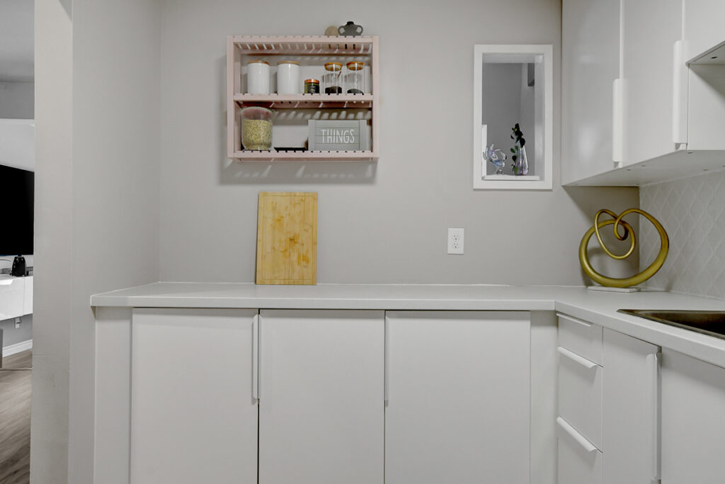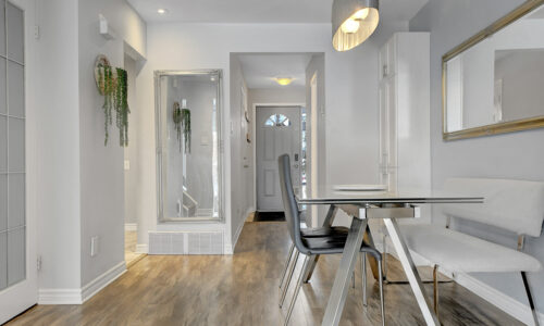 Foyer offers a comfortable space to settle in, opening to a home finished in a cool, subdued colour palette that feels tranquil & refined. Mid-tone laminate flooring runs throughout most of the home for a clean, fresh aesthetic. Crisp white kitchen features modern smooth-front cabinetry, white countertops, a delicate backsplash, and tons of storage & cooking space. Just steps from the dining area, entertaining is easy and effortless. Living room feels tucked away and comfortable, highlighted by a built-in floating media console. Patio doors open directly to the fully fenced backyard, boasting a wood landing/BBQ deck, stone patio, and lush foliage. Primary suite is generously sized with a large wall-to-wall closet and convenient cheater access to the main bathroom. Two additional bedrooms are complemented by an updated full bath that feels truly luxe.