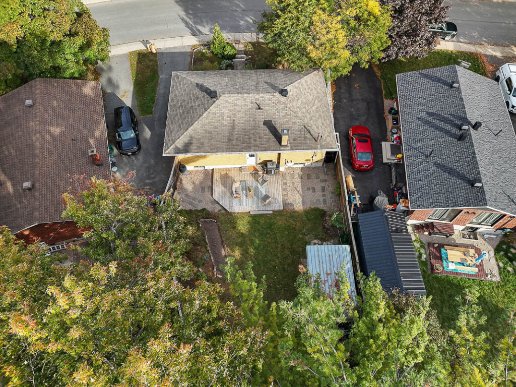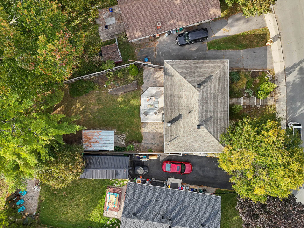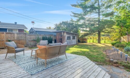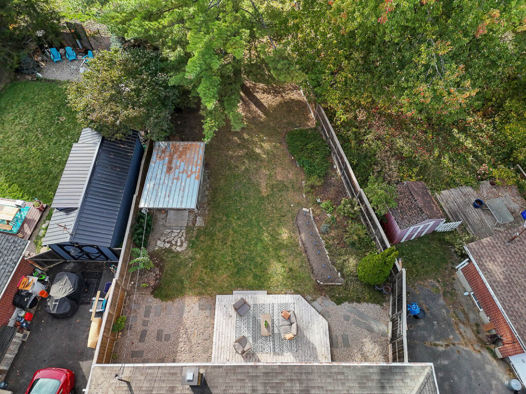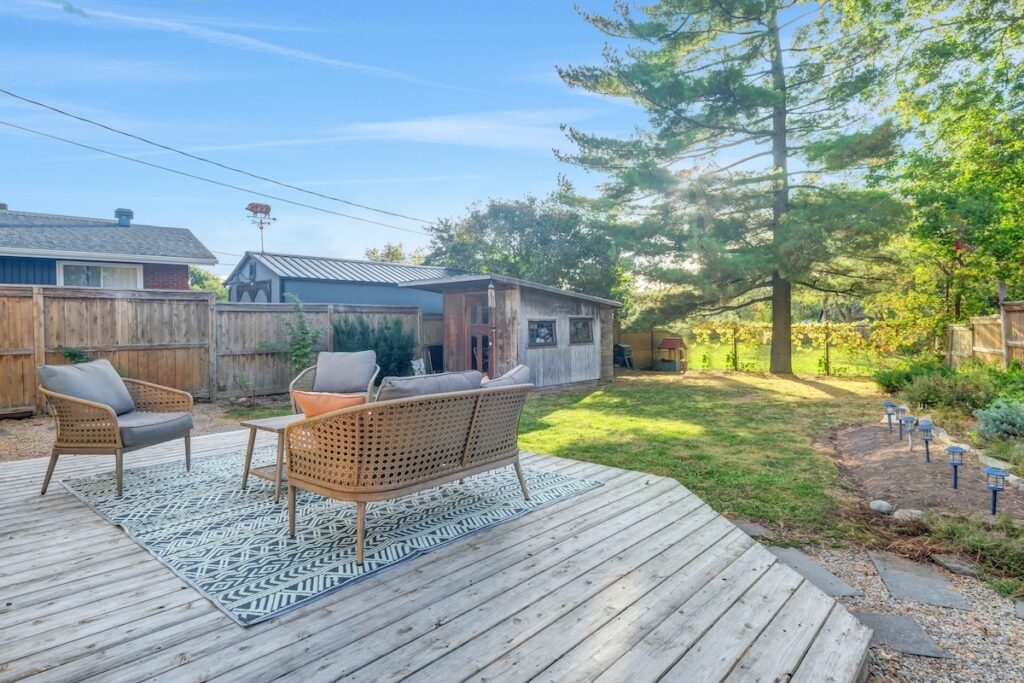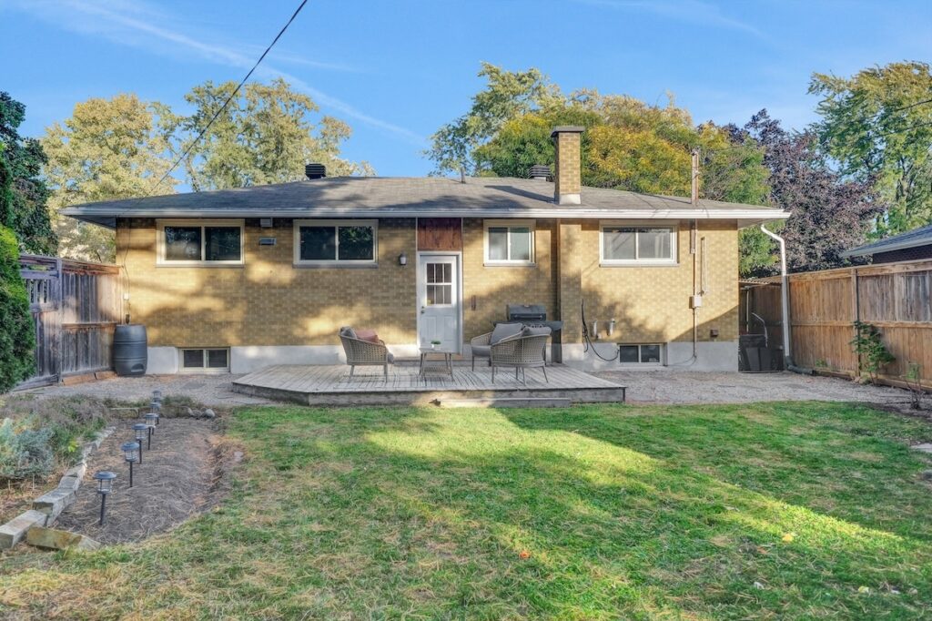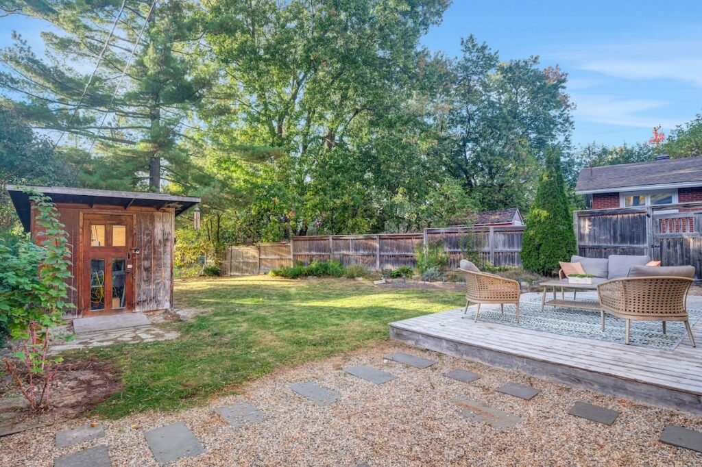 The interior has been completely transformed with an airy open-concept layout and sophisticated finishes, including crisp white paint, light hardwood floors and recessed lighting. Renovated kitchen makes a bold design statement with a striking mix of light and dark tones — sleek black cabinetry paired with gleaming countertops and an oversized tile backsplash. The family quarters are tucked quietly to one side of the home, featuring two bedrooms, including one with a walk-in closet, and a beautifully updated full bathroom. Down the feature staircase clad in warm wood paneling, the lower level extends the living space. Cork flooring, soft neutral paint, and well-placed windows enhance the natural light, creating a welcoming setting for a recreation room, full bathroom, and two additional bedrooms. Private backyard with large walkout deck, storage shed, and low-maintenance gardens framed by mature trees that add privacy and shade. With no rear neighbours and open space just beyond the fence, it feels exceptionally tranquil.