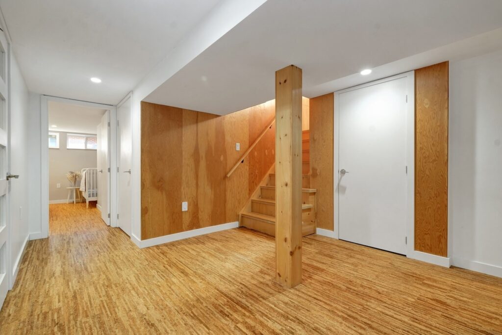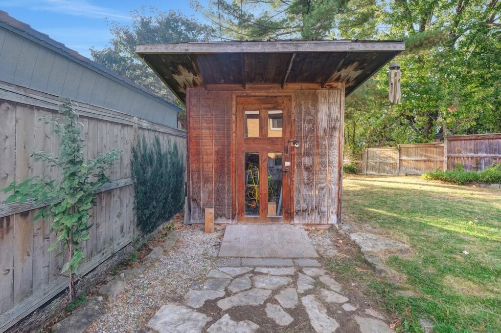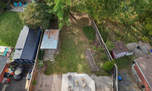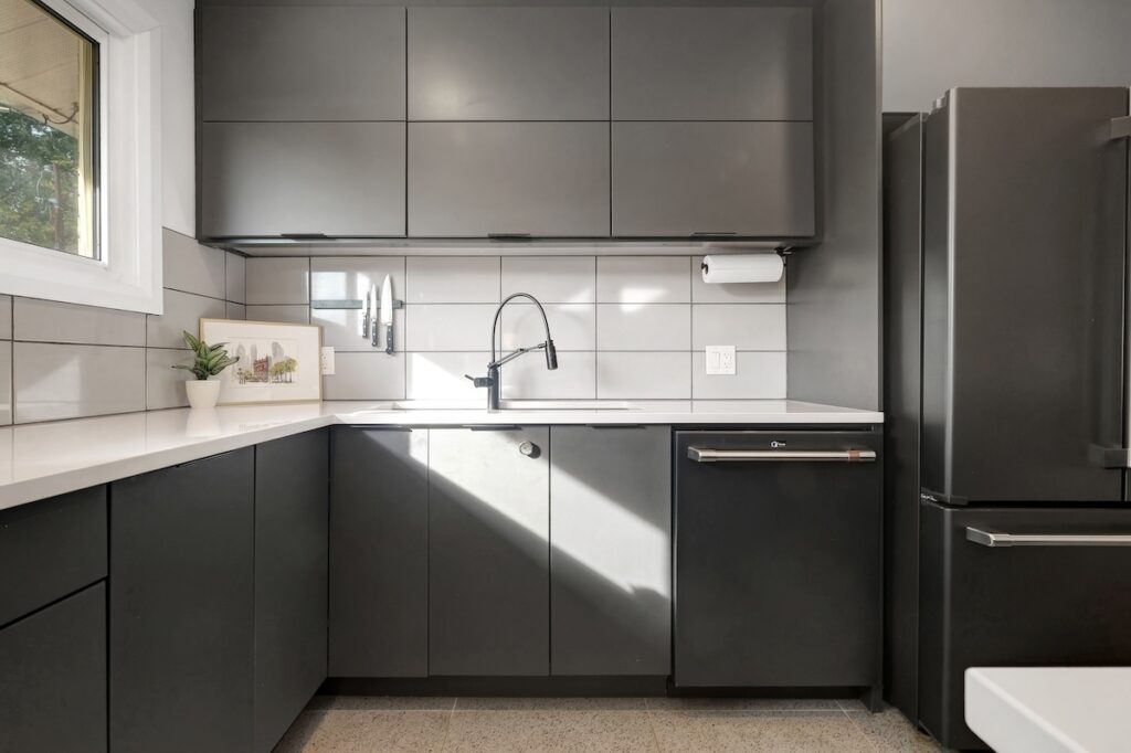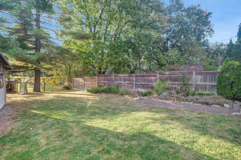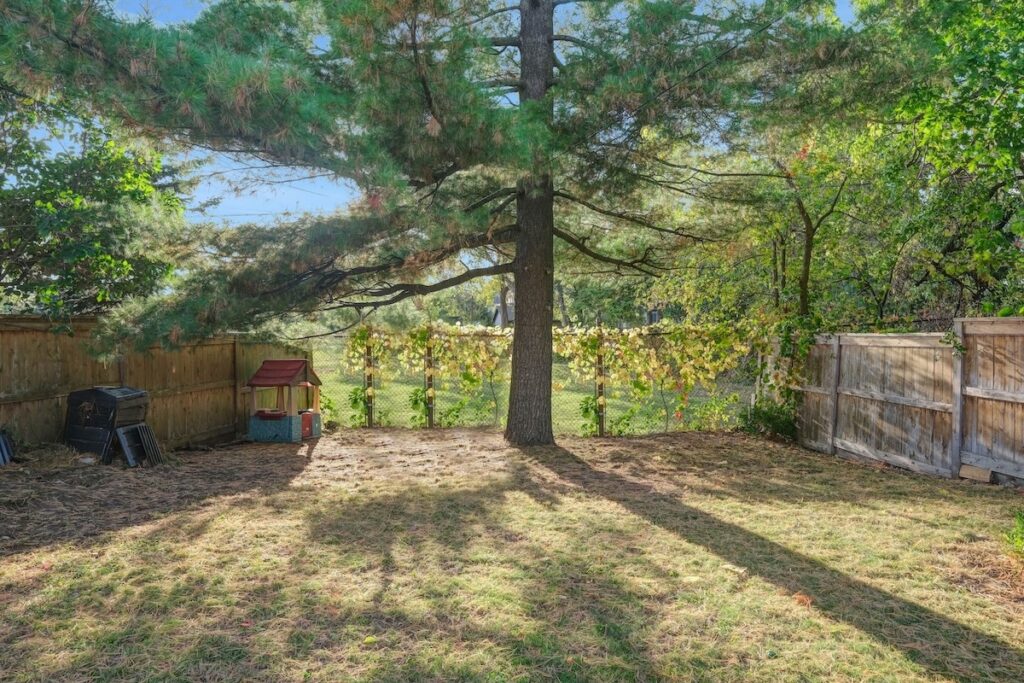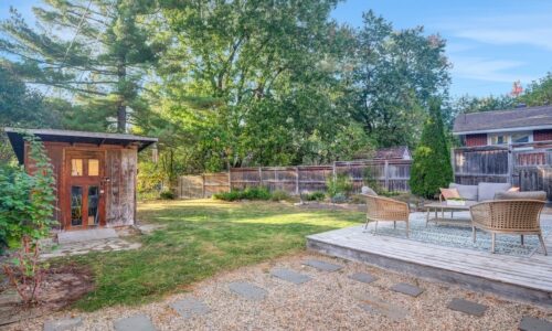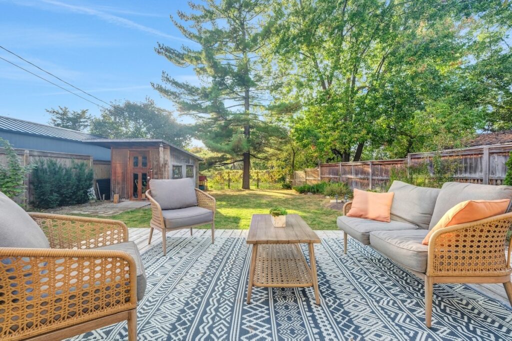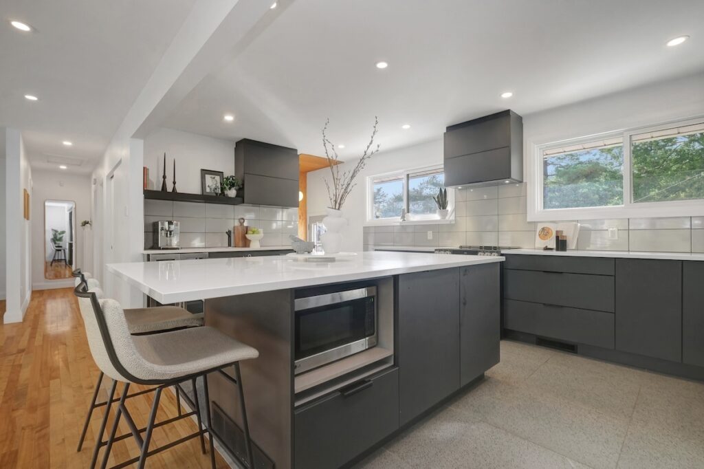 The interior has been completely transformed with an airy open-concept layout and sophisticated finishes, including crisp white paint, light hardwood floors and recessed lighting. Renovated kitchen makes a bold design statement with a striking mix of light and dark tones — sleek black cabinetry paired with gleaming countertops and an oversized tile backsplash. The family quarters are tucked quietly to one side of the home, featuring two bedrooms, including one with a walk-in closet, and a beautifully updated full bathroom. Down the feature staircase clad in warm wood paneling, the lower level extends the living space. Cork flooring, soft neutral paint, and well-placed windows enhance the natural light, creating a welcoming setting for a recreation room, full bathroom, and two additional bedrooms. Private backyard with large walkout deck, storage shed, and low-maintenance gardens framed by mature trees that add privacy and shade. With no rear neighbours and open space just beyond the fence, it feels exceptionally tranquil.
